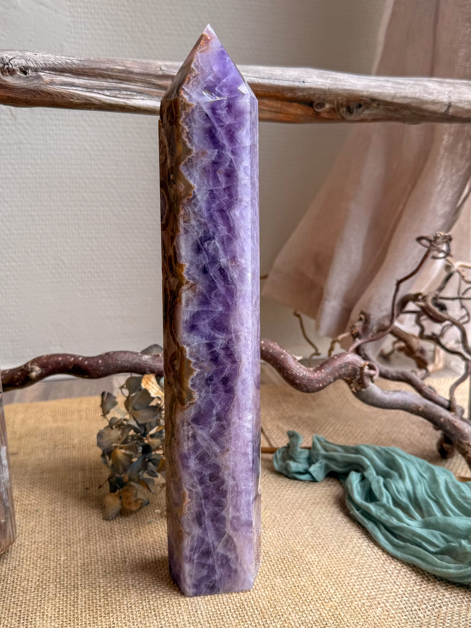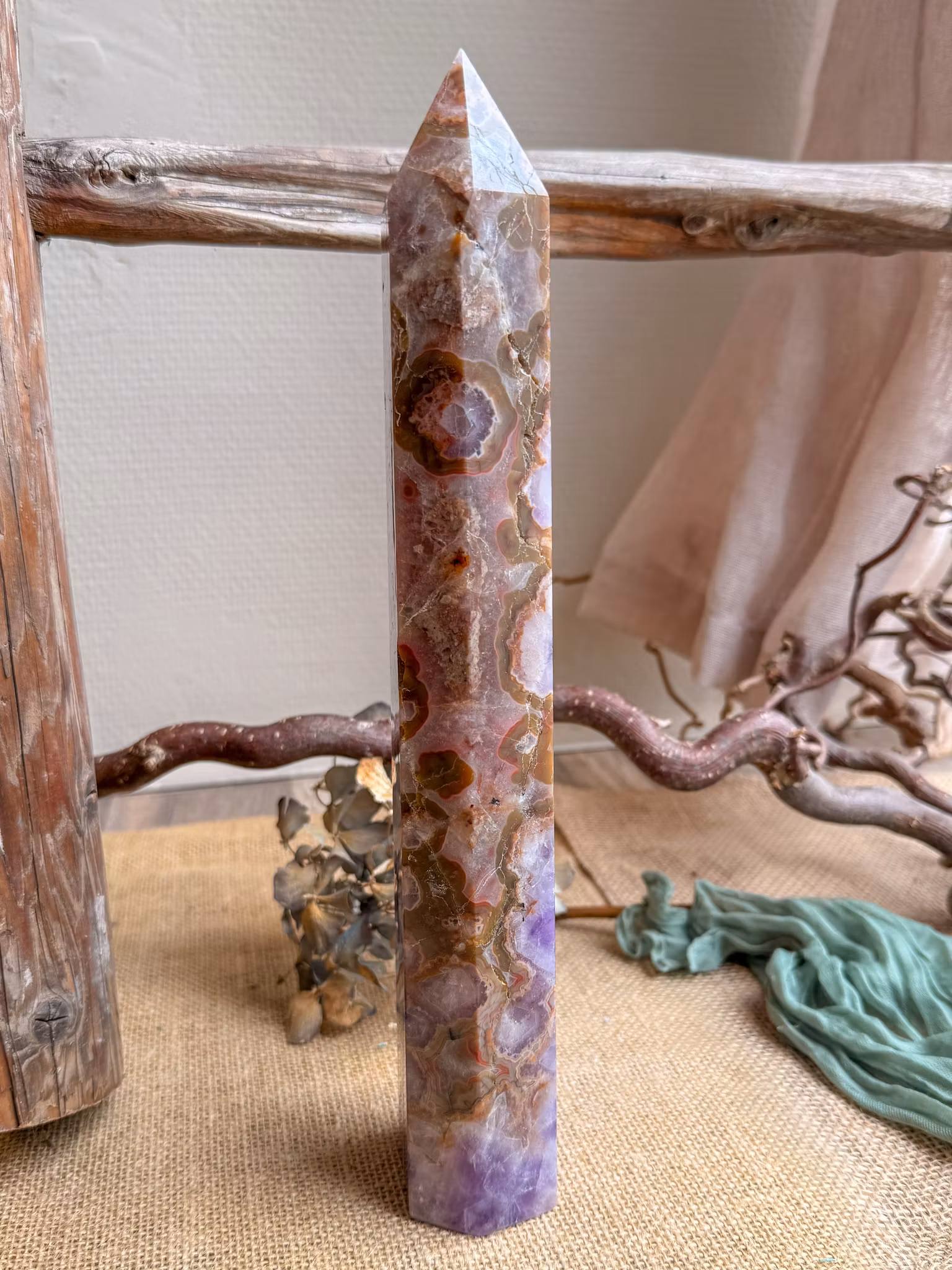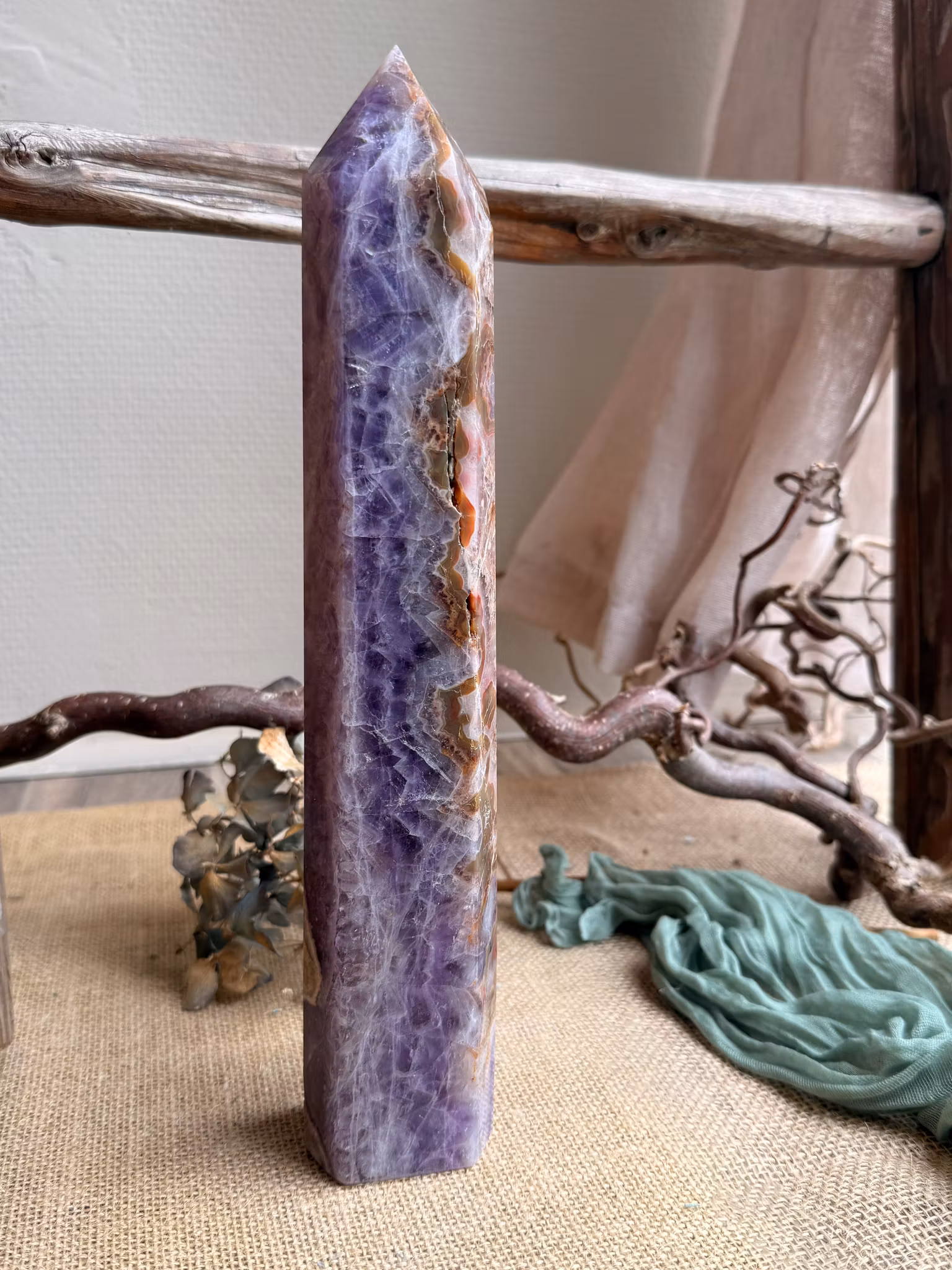 Den här kristallen bildas i Mexikos vulkaniska miljö, där ametistens djupa violetta toner möter spetsagatens livfulla, virvlande mönster. Kontrasten mellan dem skapar ett uttryck som både känns stilla och levande.