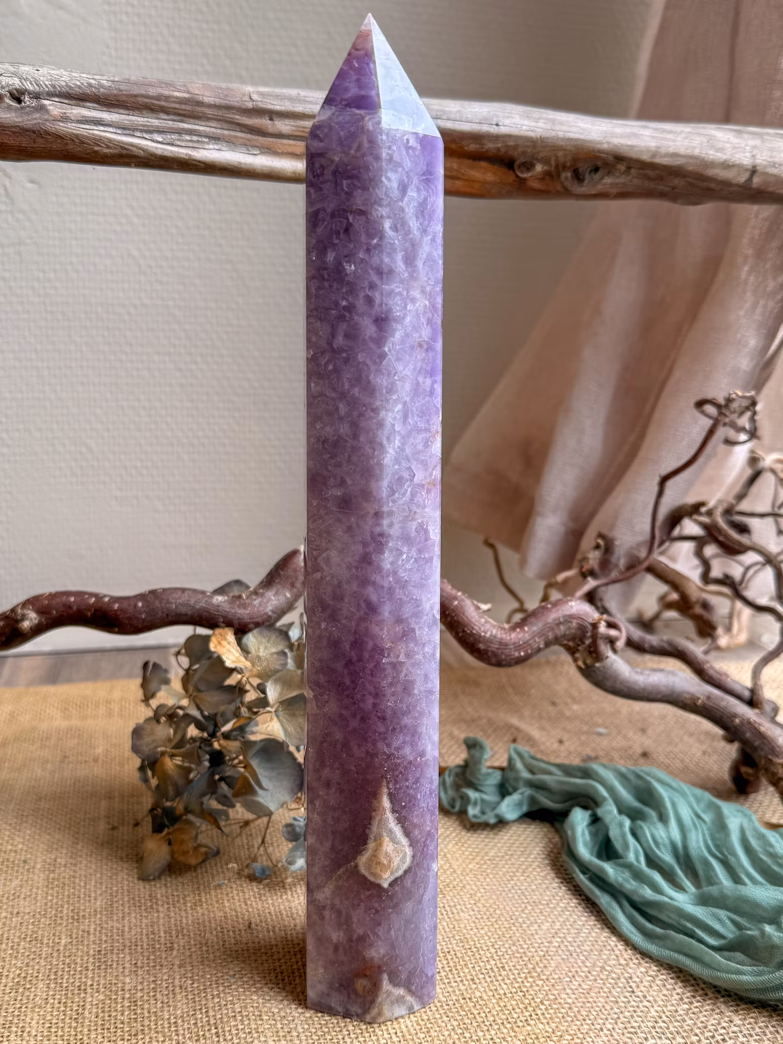 Ametist förknippas med lugn, klarhet och att släppa oro. Den hjälper dig att landa i tankarna och se mer tydligt på det som pågår.