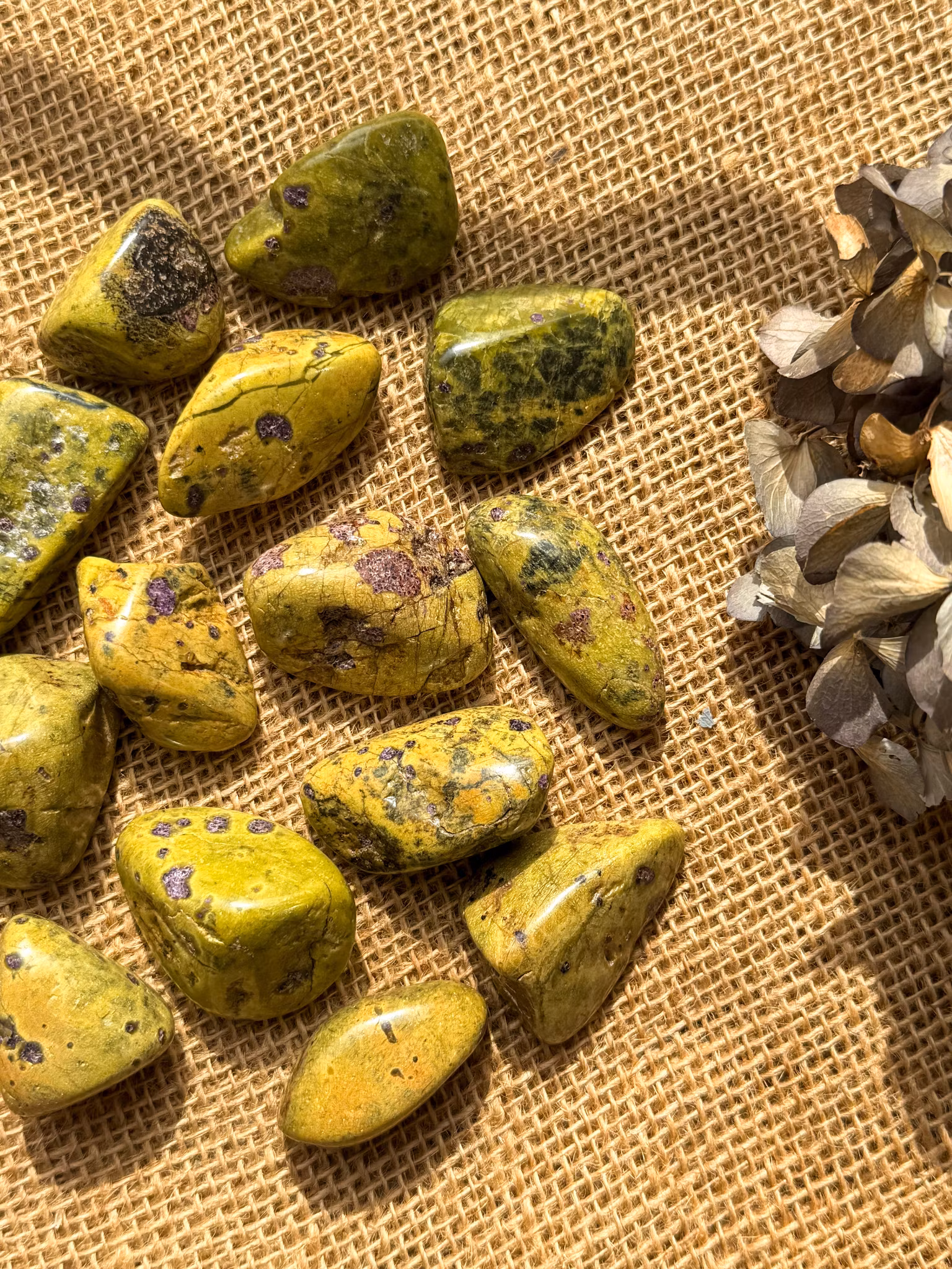 Färgerna är naturens egna symboler: Serpentinens gröna jordtoner står för trygghet och förankring, medan Stichtitens lila nyanser för in andlighet, beskydd och förlåtelse. Kombinationen skapar en levande harmoni, som om stenen i sig bar ett löfte om fred och förståelse.