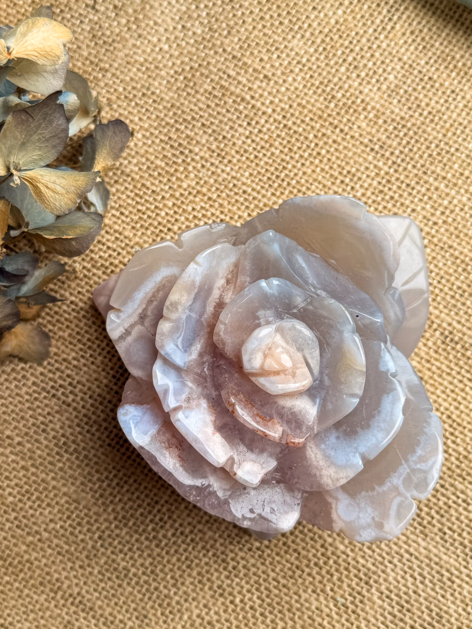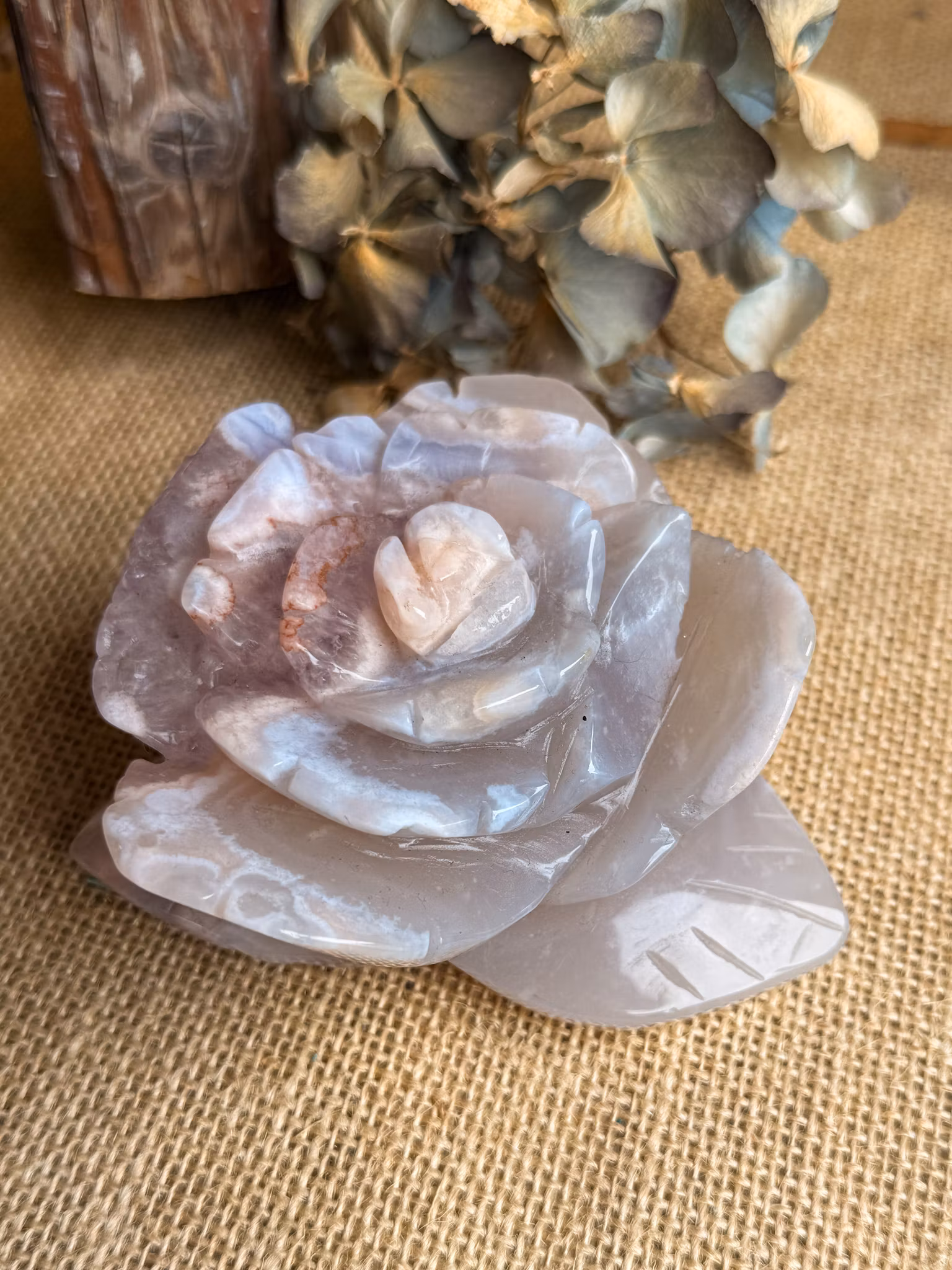 Det är en variant av agat med mjuka inneslutningar som skapar mönster som liknar små blommor. Färgerna rör sig i ljusrosa och vitt, och ger kristallen ett levande men lugnt uttryck.