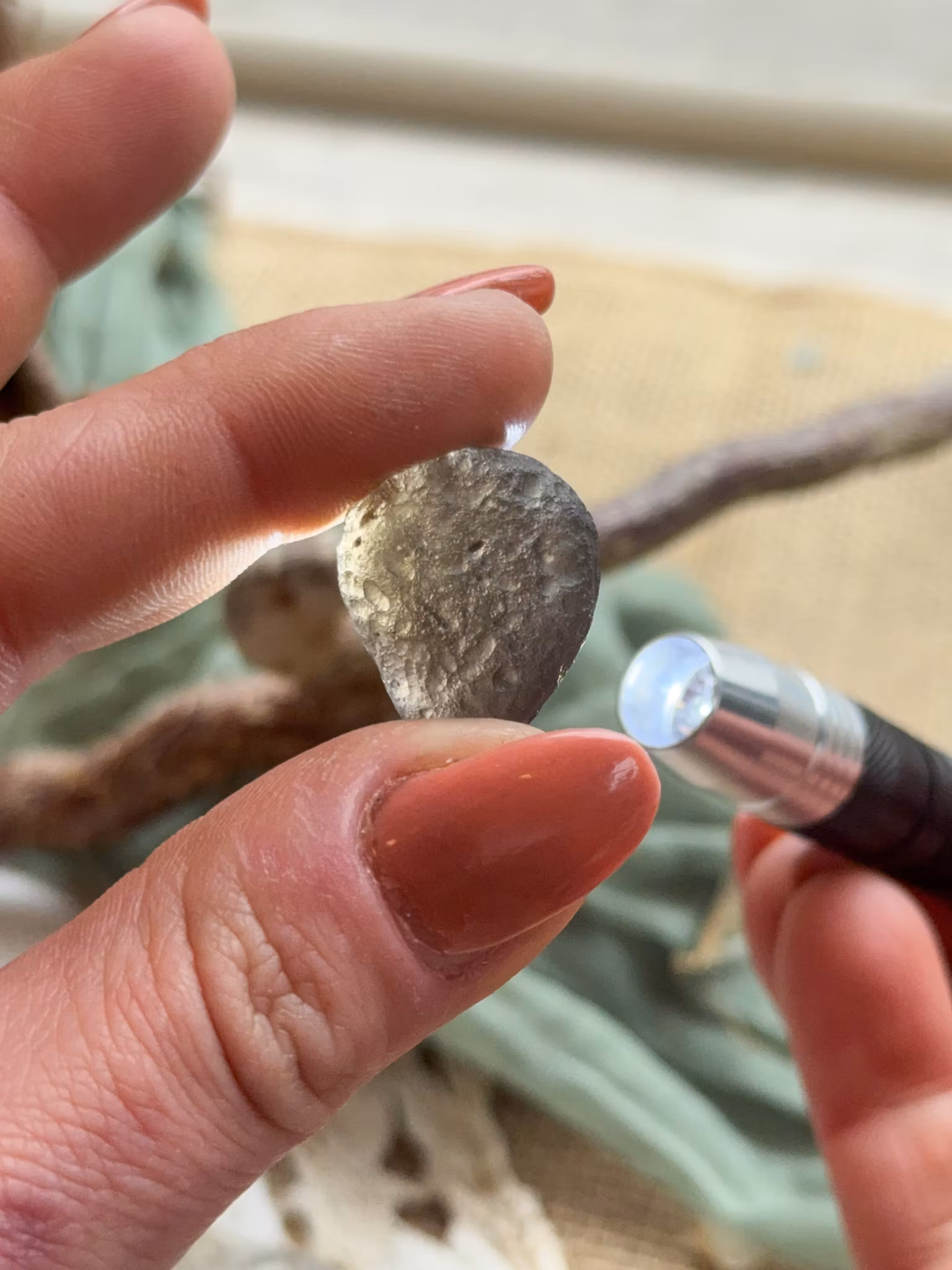 Färgen är mörk, ofta svart eller rökig, men när ljuset träffar den kan den bli genomskinlig i grå eller lätt gyllene toner. Ytan är naturligt formad, ibland slät, ibland mer rå, med ett uttryck som känns både gammalt och levande.