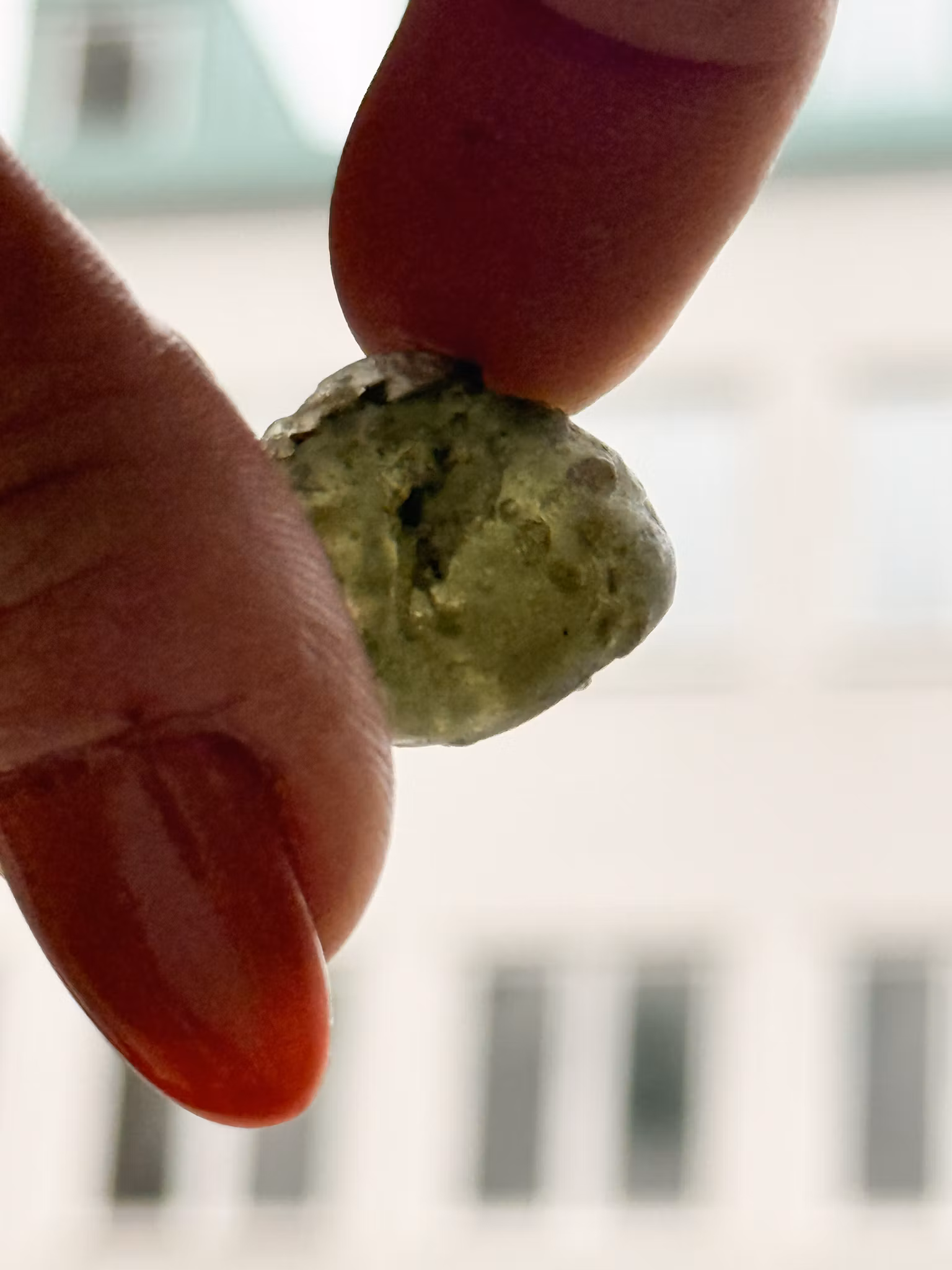 Färgen är mörkgrön till nästan svart, ibland med genomskinliga partier när ljuset träffar den. Ytan är rå, ojämn och har ett uttryck som känns mer jord än glas.