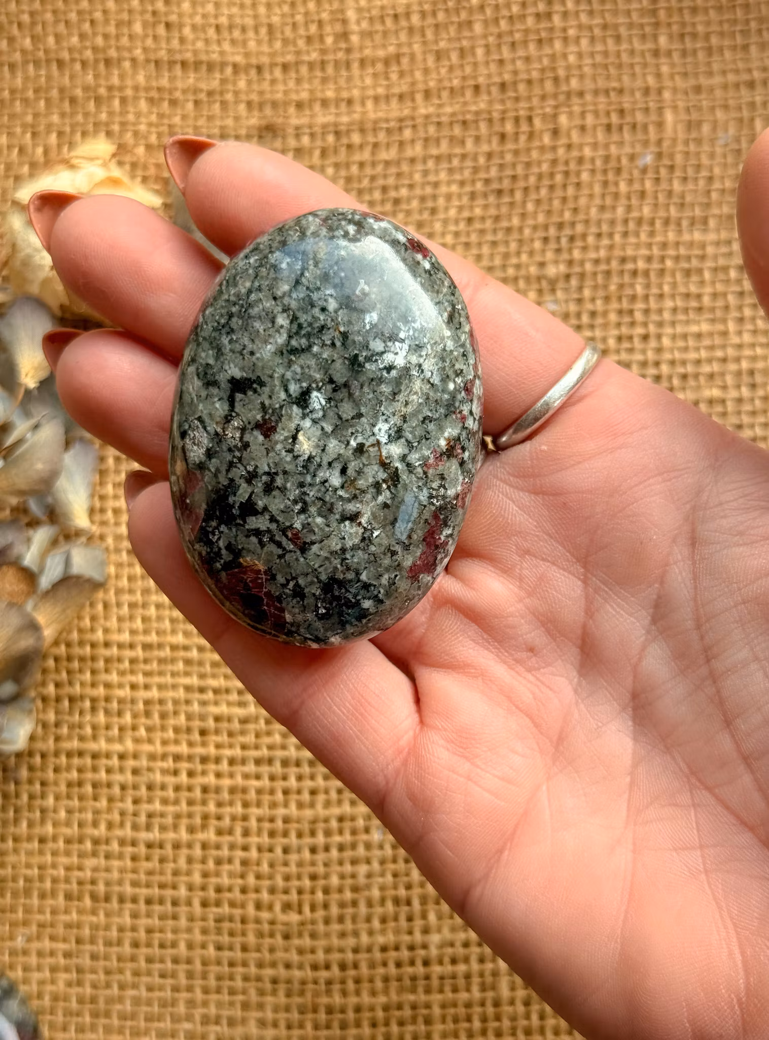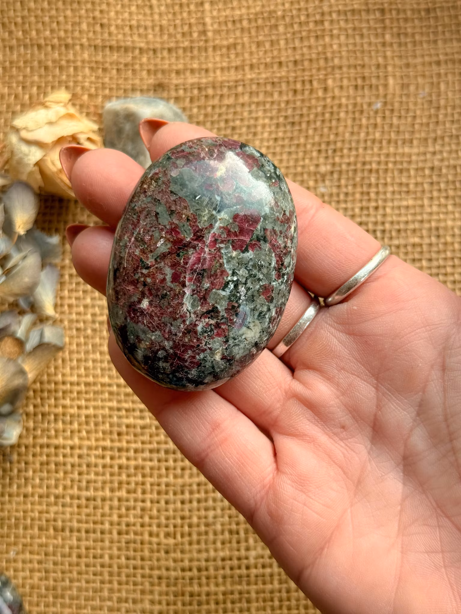 Färgen påminner om granat, men eudialyt har en egen själ. Den röda tonen föds ur järn och mangan, som tillsammans skapar en vibration av mod, passion och återfödelse. En kristall för dig som vill känna dig levande på riktigt – trygg, men ändå öppen.
