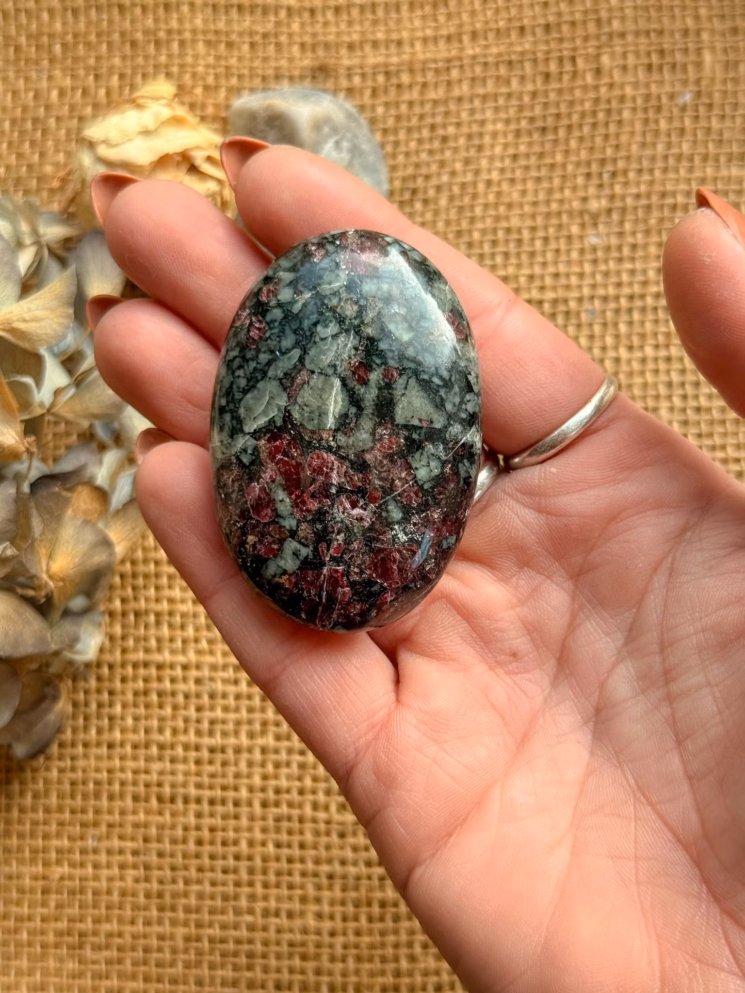 Färgen påminner om granat, men eudialyt har en egen själ. Den röda tonen föds ur järn och mangan, som tillsammans skapar en vibration av mod, passion och återfödelse. En kristall för dig som vill känna dig levande på riktigt – trygg, men ändå öppen.