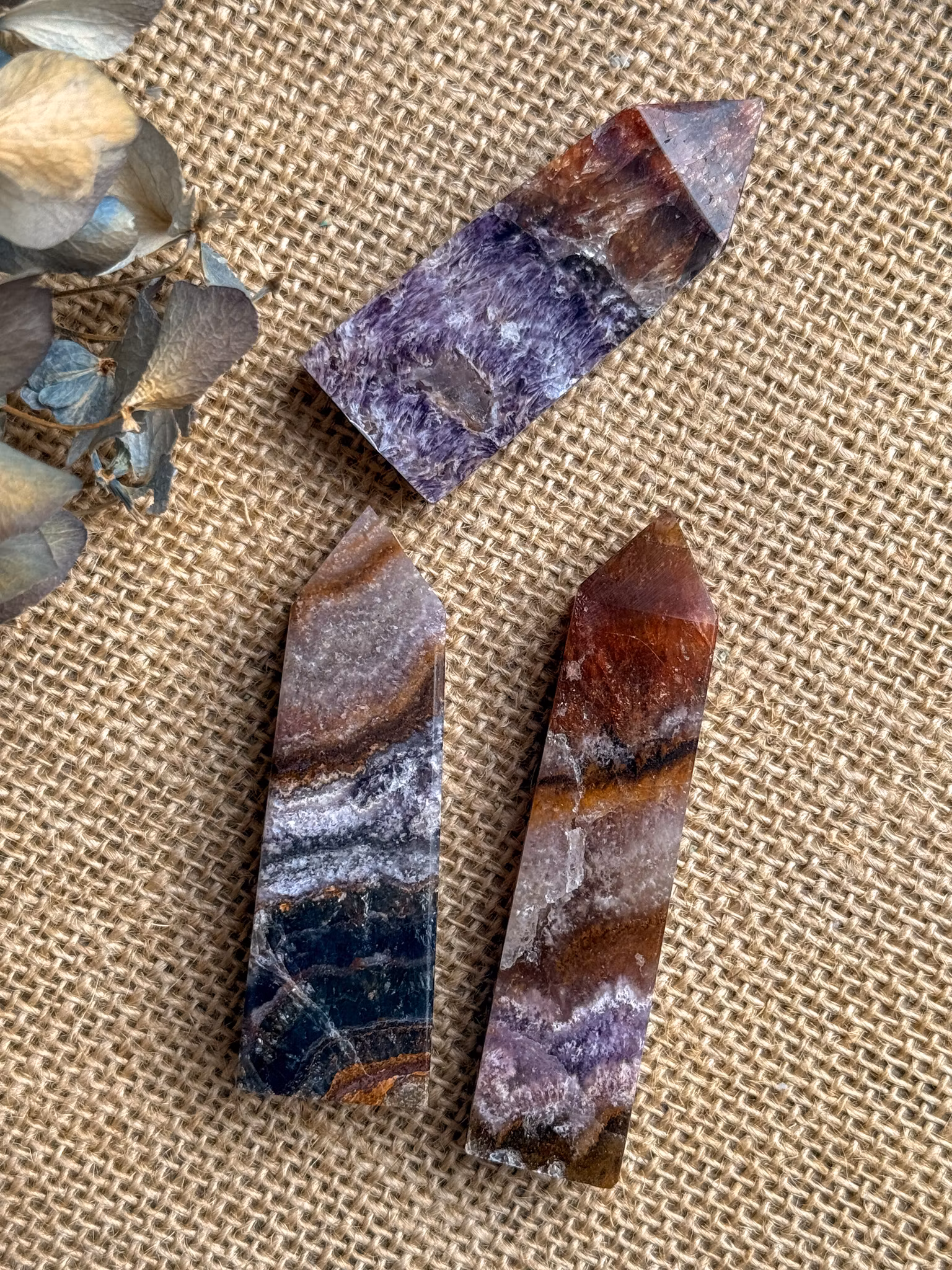Fluorit kopplas ofta till klarhet och struktur i tankar. Rökkvarts förknippas med jordning och att landa i det som är. Pyrit associeras med driv, riktning och att ta steg framåt. Tillsammans bildar de en kombination som stöttar tydliga beslut och mod att genomföra det du redan känner är rätt.