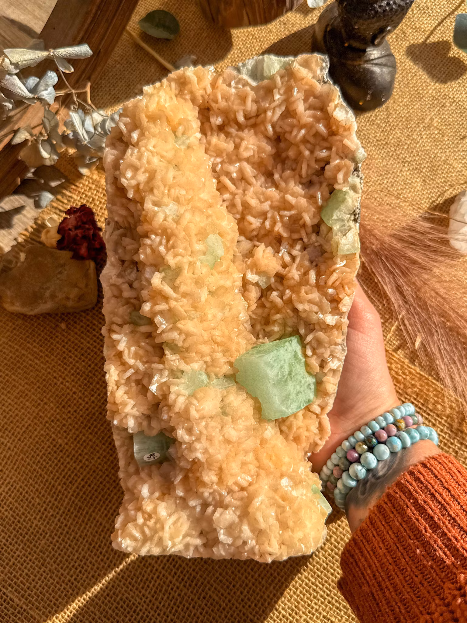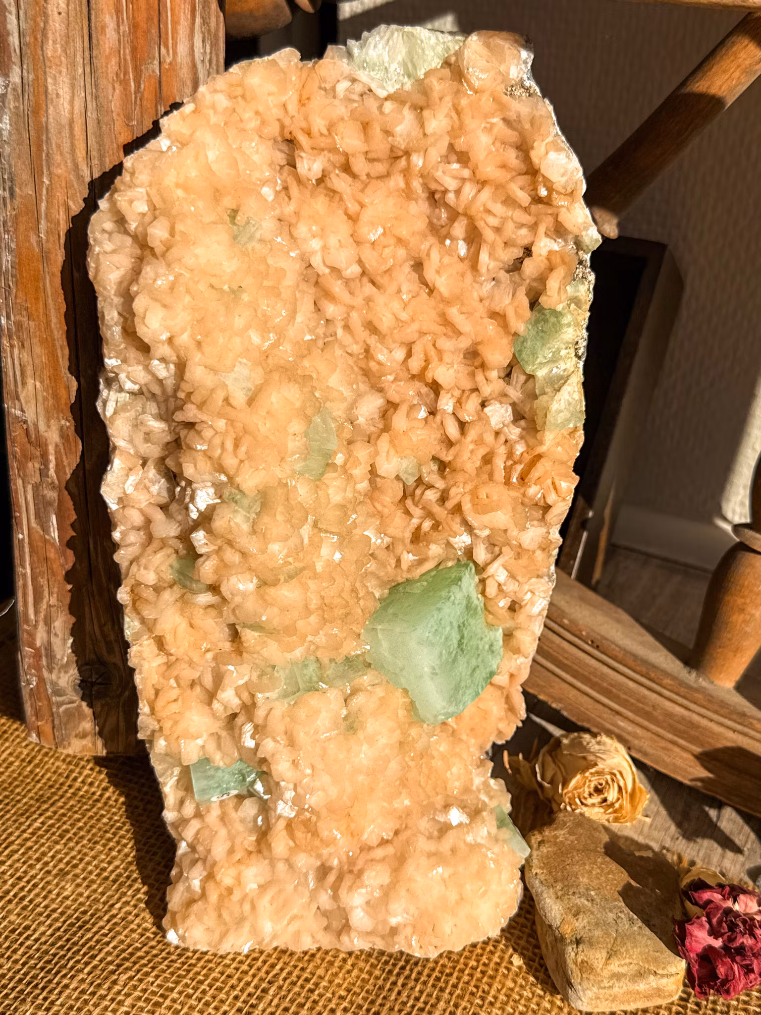 I denna högfrekventa kombination möts två mineraler som tillsammans öppnar för hjärtats intelligens och själens lugn. Den gröna apofylliten för in klarhet i emotionella processer och hjälper dig att se det du tidigare inte vågat möta. Stilbiten, med sin mjuka och omhändertagande energi, lindrar känslomässig smärta och bjuder in trygg närvaro.