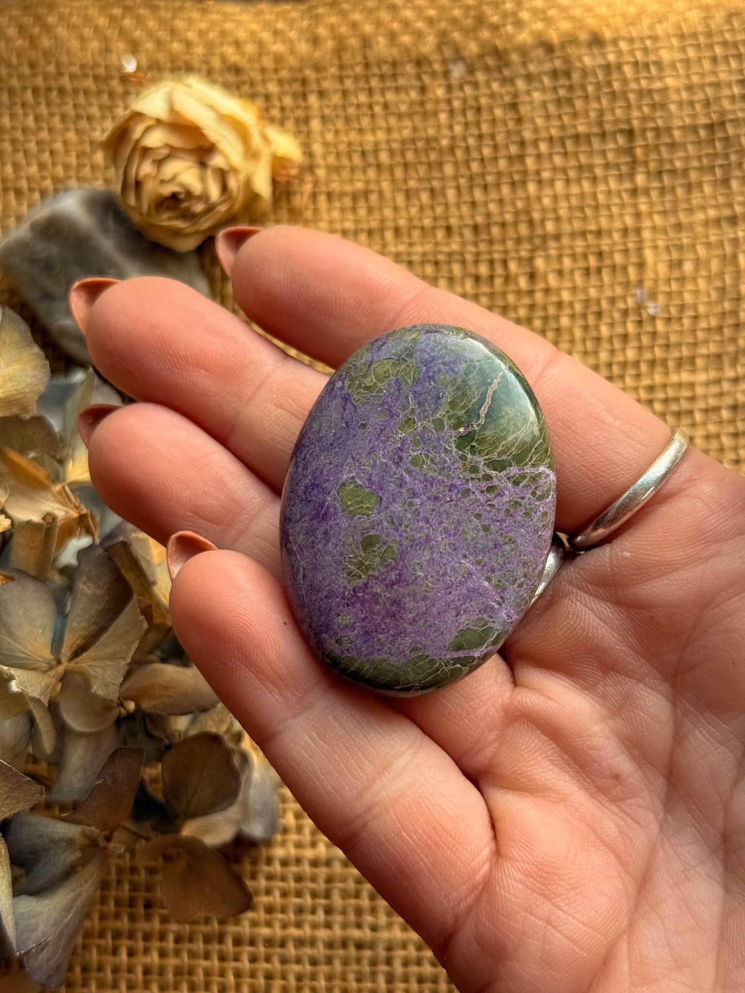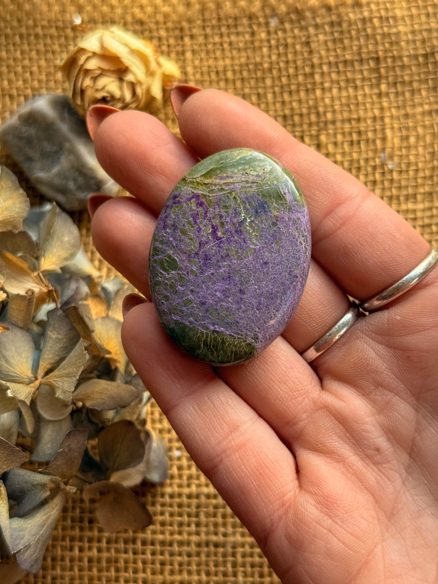 Stichtit med Serpentin är en mjuk lavendelfärgad kristall med inslag av grönt, en naturlig förening mellan hjärtats energi och jordens lugn.Tillsammans väcker d