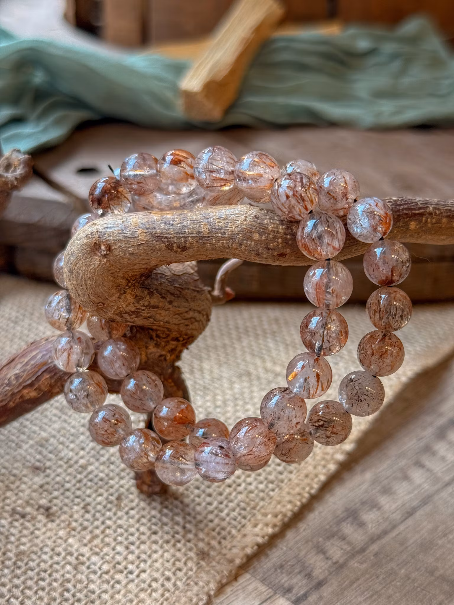 Mineralogiskt är detta en ovanlig form av bergkristall som innehåller nållika kristaller av rutil med kopparinslag – vilket ger den dess varma, gyllene färgskiftning. Varje pärla är ett unikt fragment av naturens egen intelligens, formad under högt tryck och temperatur djupt i jordens inre.