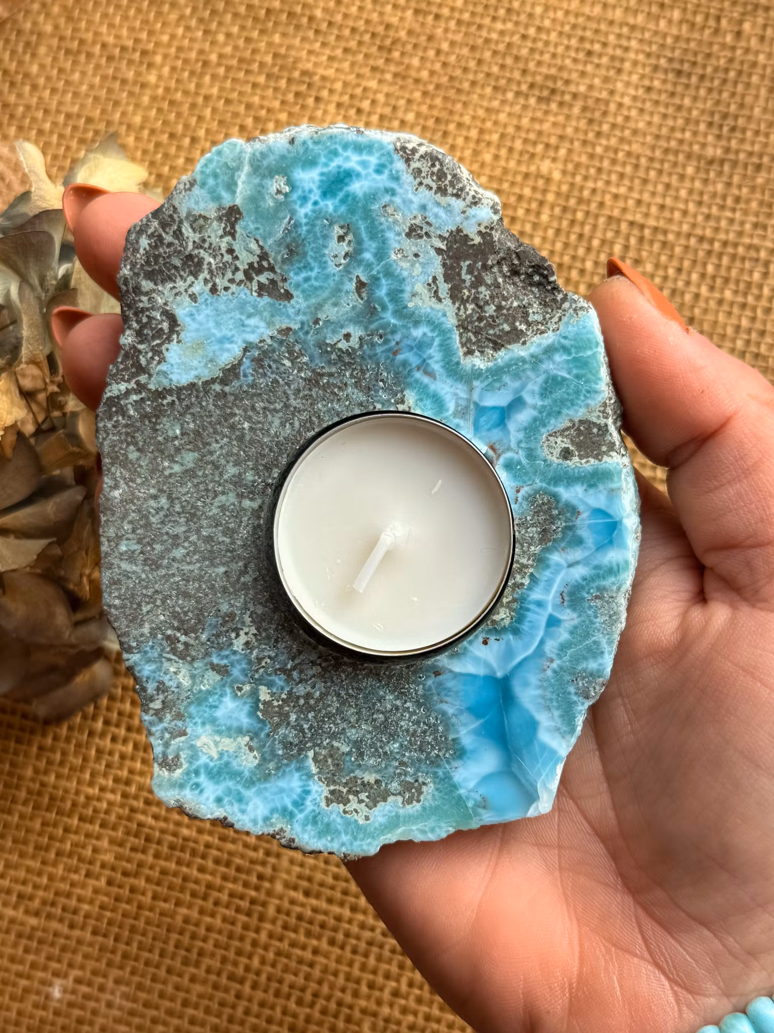 Som lykta höjs vibrationerna och kristallen vaknar till liv. Ljuset rör sig genom Larimar och sprider en klar, mjuk energi i hela rummet. Den hjälper dig känna mod, närvaro och tillit till livets flöde.