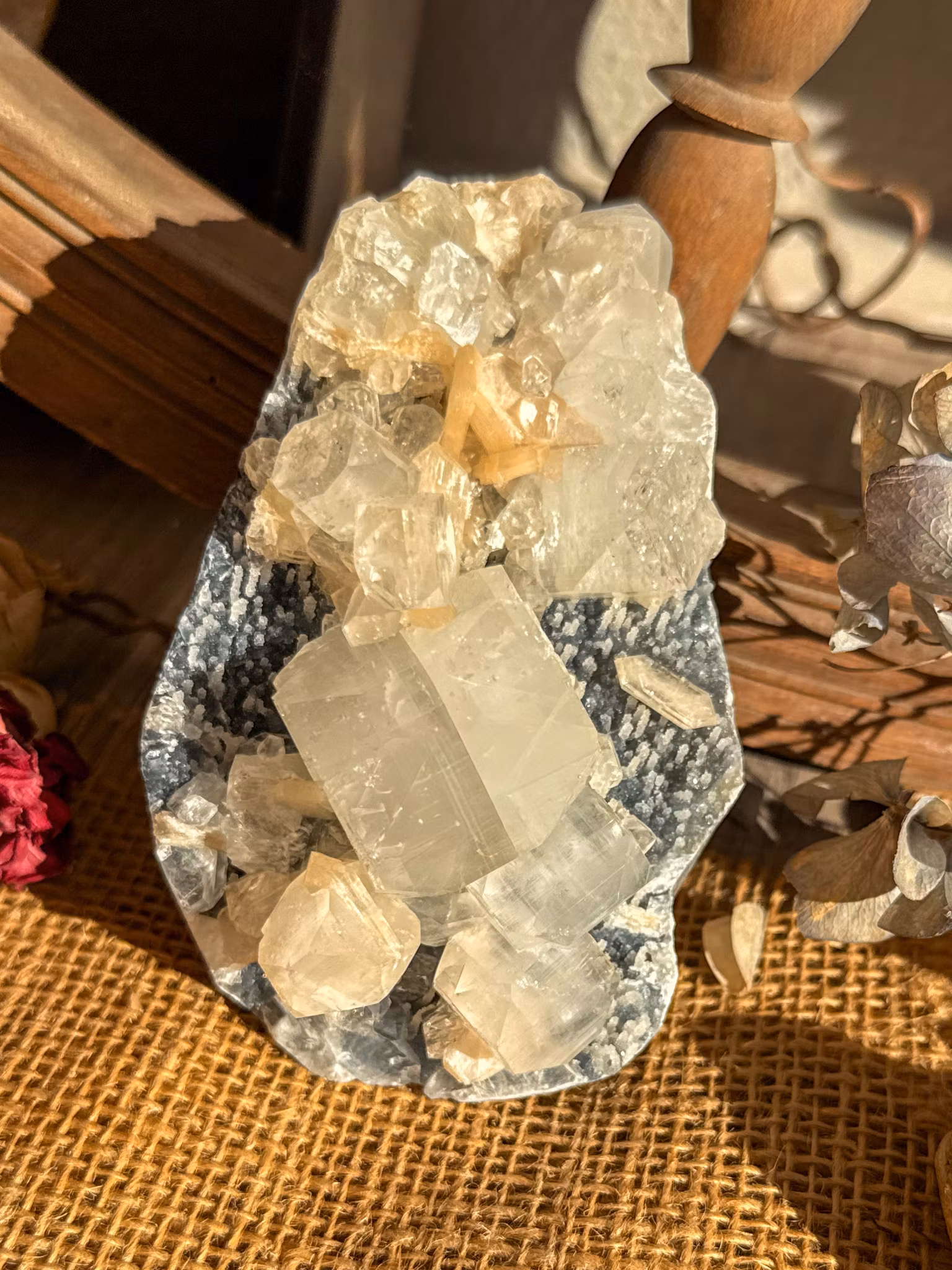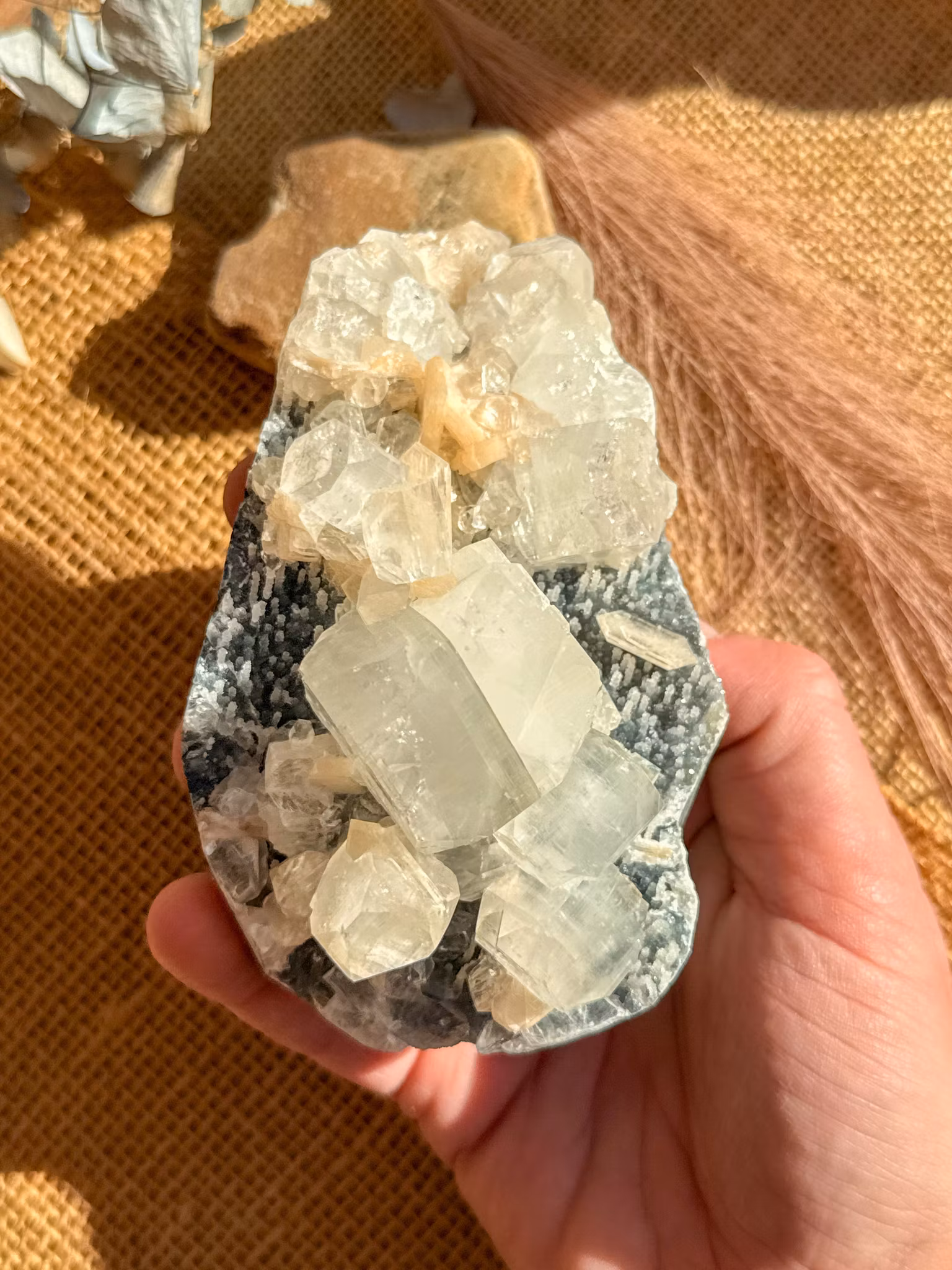 Denna sällsynta kombination för samman tre högvibrerande mineraler i ett enda stycke: skimrande blå kalcedon som bäddar in energin i mjukt lugn, klar apofyllit som höjer medvetandet och öppnar din kontakt uppåt, samt stilbit – den trygga viskningen från hjärtat som säger att du är hållen, alltid.