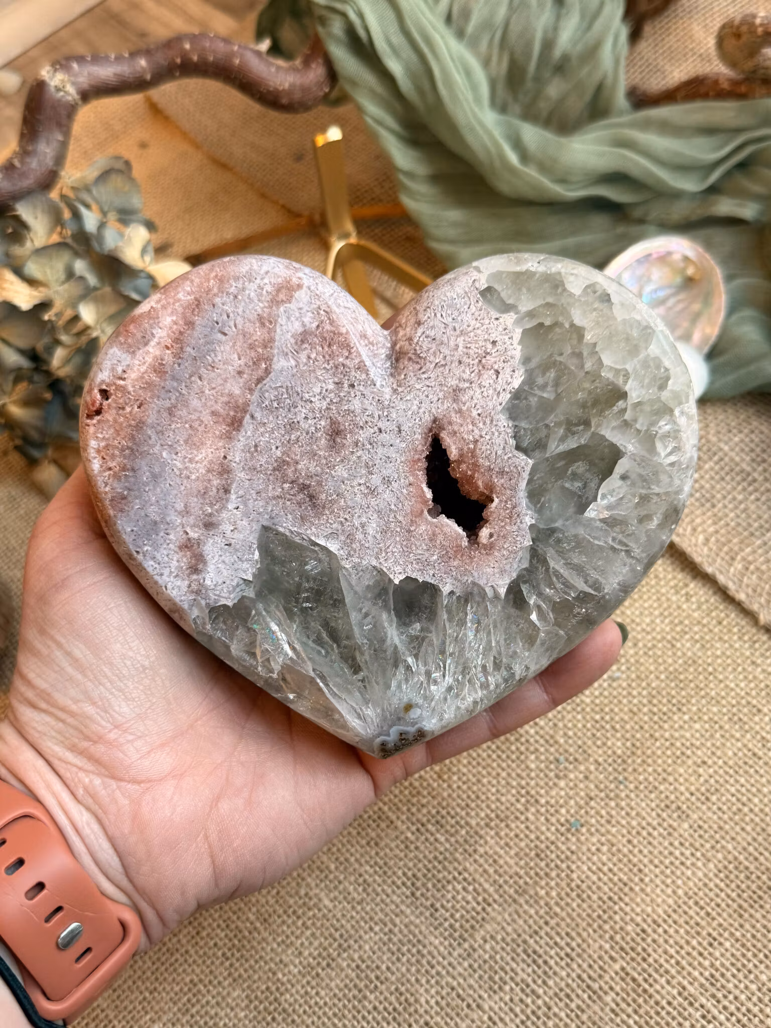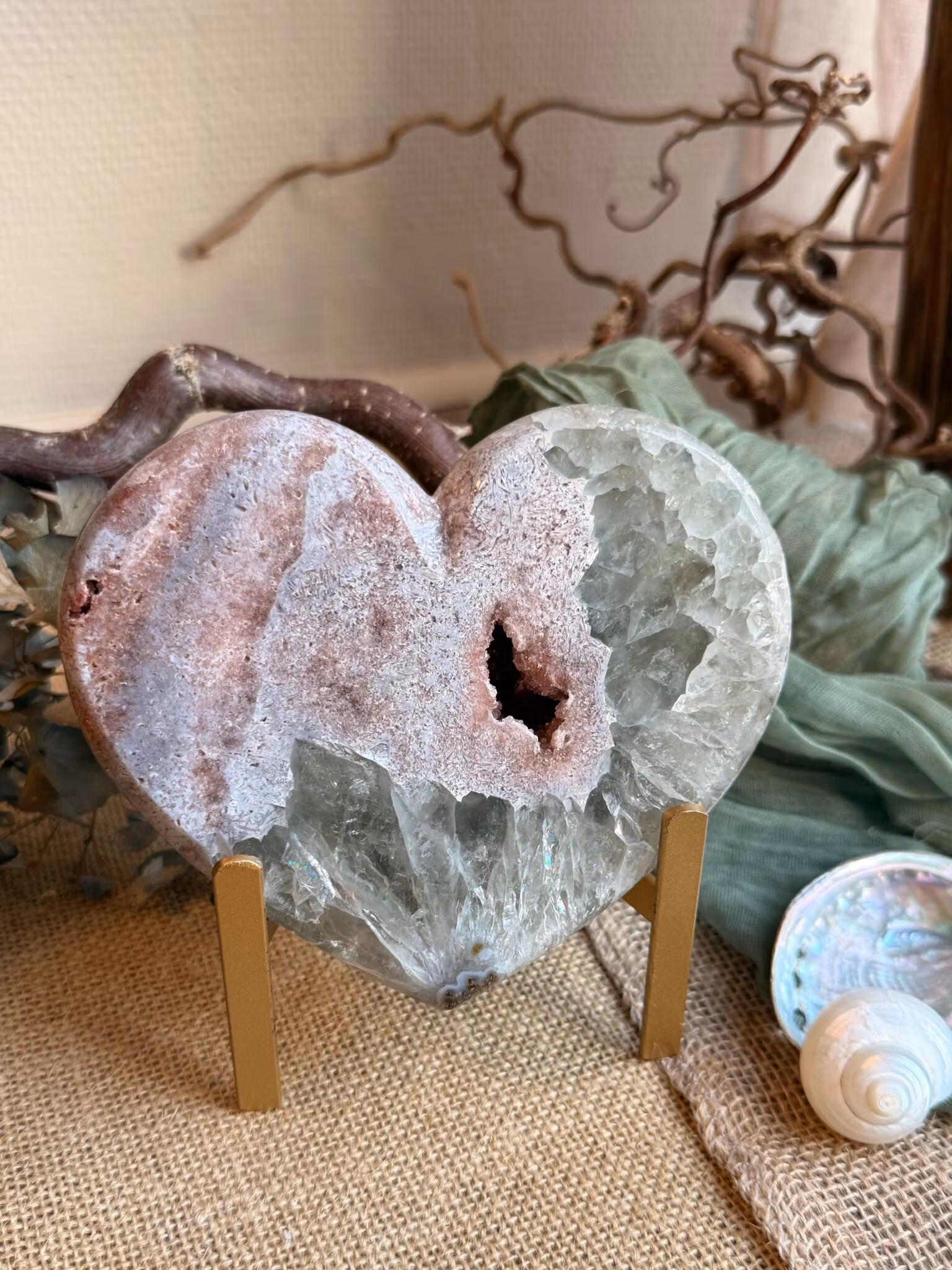 Tillsammans skapar rosa ametist och prasiolit en balanserad helhet. Den rosa ametisten mjukar upp och öppnar. Prasioliten håller samman och ger stabilitet. Tillsammans ger de en energi som känns trygg, harmonisk och stadig, utan att bli tung. När kristallen formas till ett hjärta förstärks detta samspel ytterligare. Hjärtformen samlar uttrycket och riktar energin inåt rummet. Den bidrar med omsorg, närvaro och balans och gör kristallen till en naturlig mittpunkt.