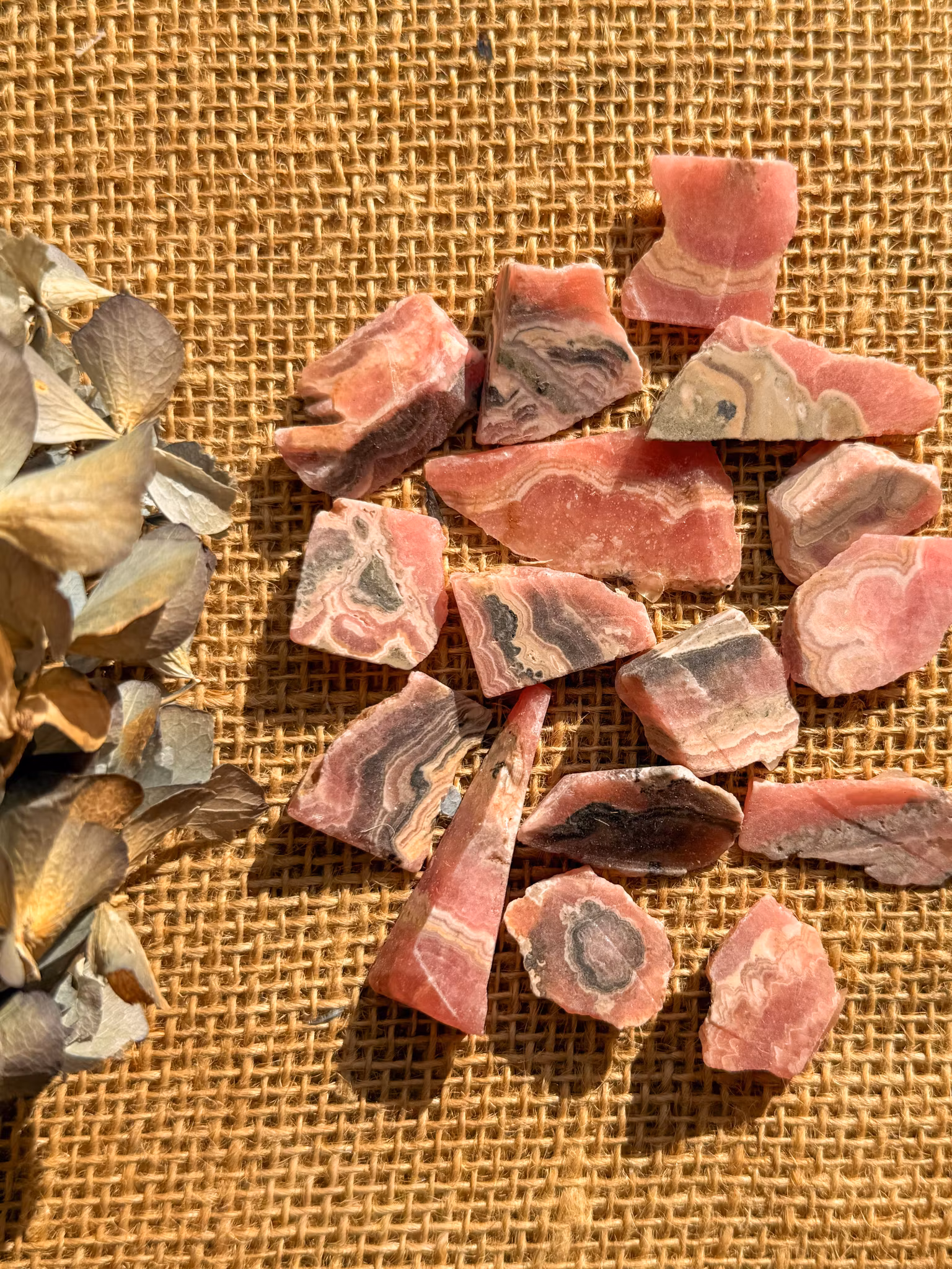 Rodokrosit formas naturligt i mjuka rosa toner med vita band, ofta från Argentina där mangan ger den dess karakteristiska färg. Det är en kristall som nästan känns pulserande i sin närvaro, som om den redan vet vägen hem till hjärtat.