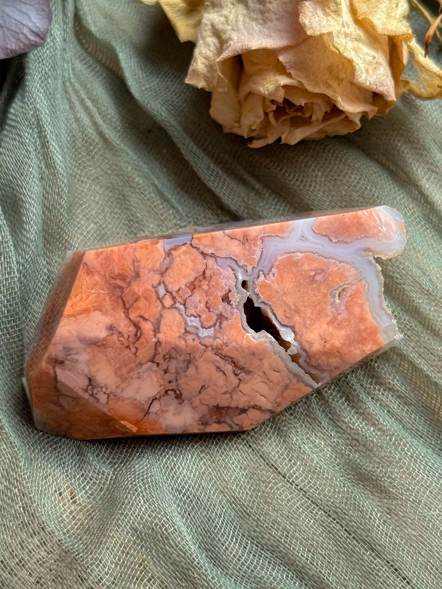 Rosa agat med kalcedon, även kallad Rosa petal agat. Är en sällsynt och hjärteburen kristall som bär milda persikorosa toner, vita kalcedonband och glittrande druzy. Med sitt blommande mönster och karamelliga färgskiftningar påminner den om något sött och tryggt, men bär en energi som verkar djupt.