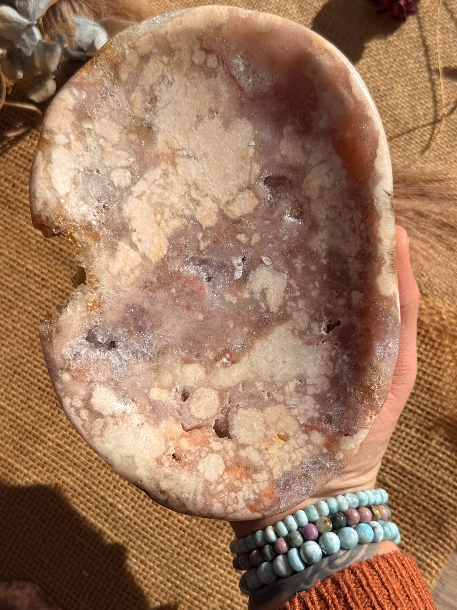 Rosa ametist känns som en mjuk hand över hjärtat. En kristall som bär en stillsam rosa ton tack vare små mängder järn och ibland inslag av mangan. Det är det som ger den dess milda färgskiftning och den lugna, hjärtöppnande energi som skiljer den från den klassiska lila ametisten. Den rör sig i ett annat register – mjukare, mer läkande, mer inåtvänt.