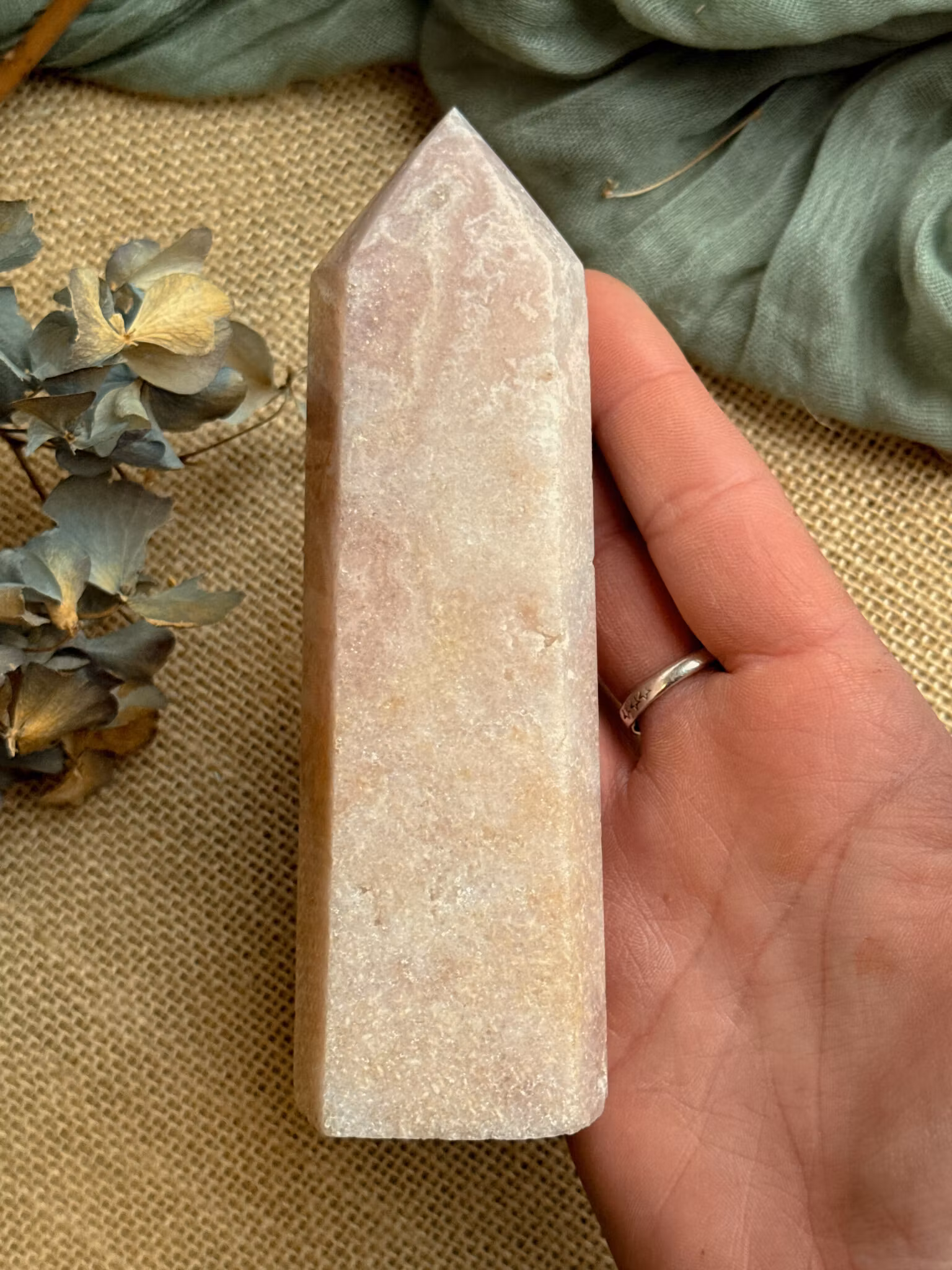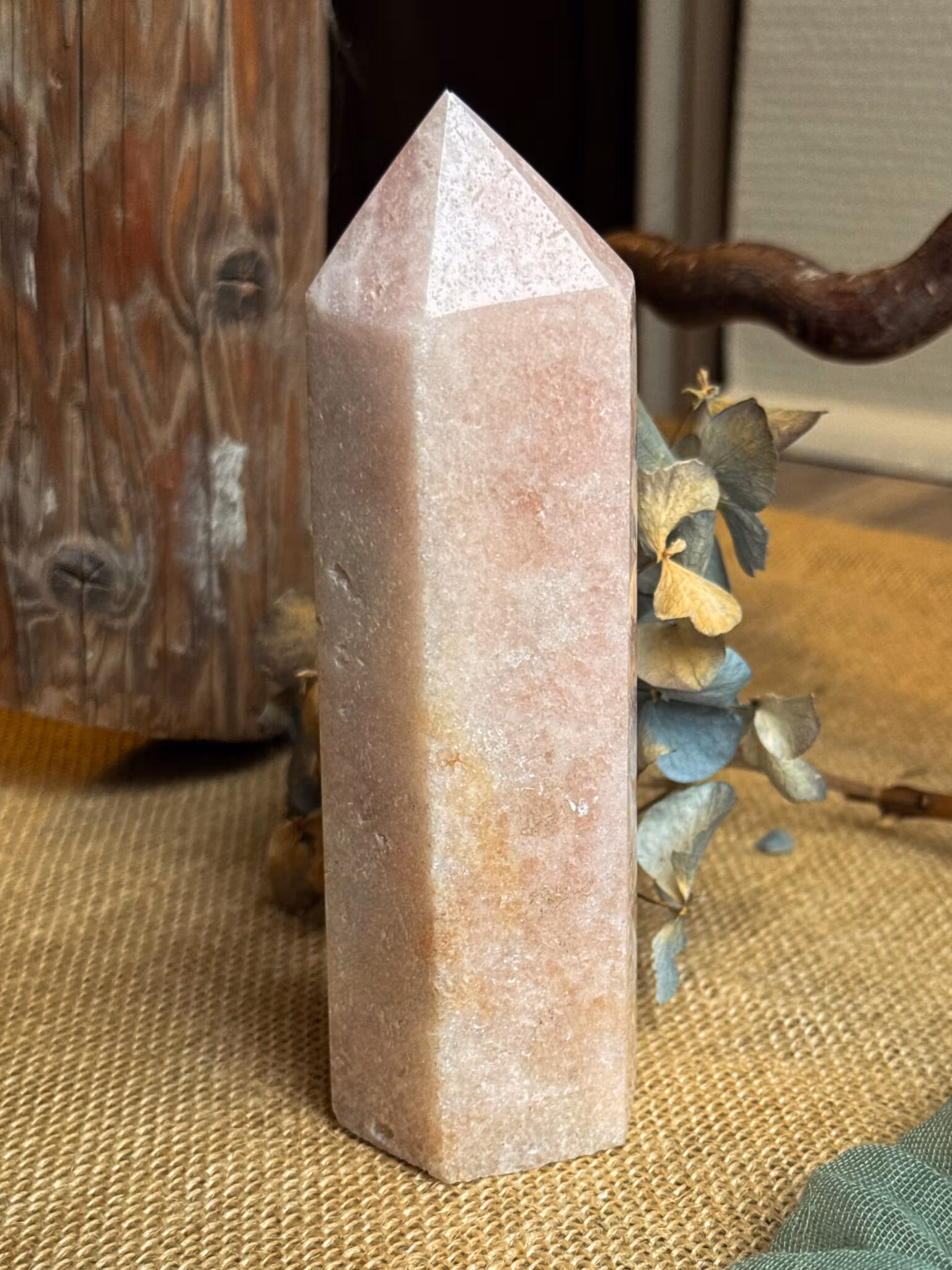 Rosa ametist känns som en mjuk hand över hjärtat. En kristall som bär en stillsam rosa ton tack vare små mängder järn och ibland inslag av mangan. Det är det som ger den dess milda färgskiftning och den lugna, hjärtöppnande energi som skiljer den från den klassiska lila ametisten. Den rör sig i ett annat register – mjukare, mer läkande, mer inåtvänt.