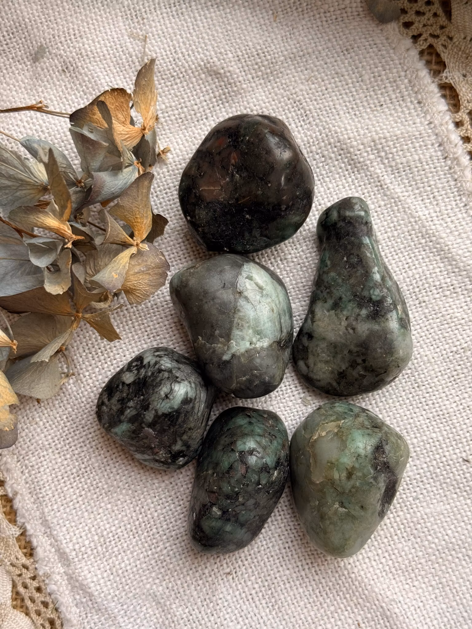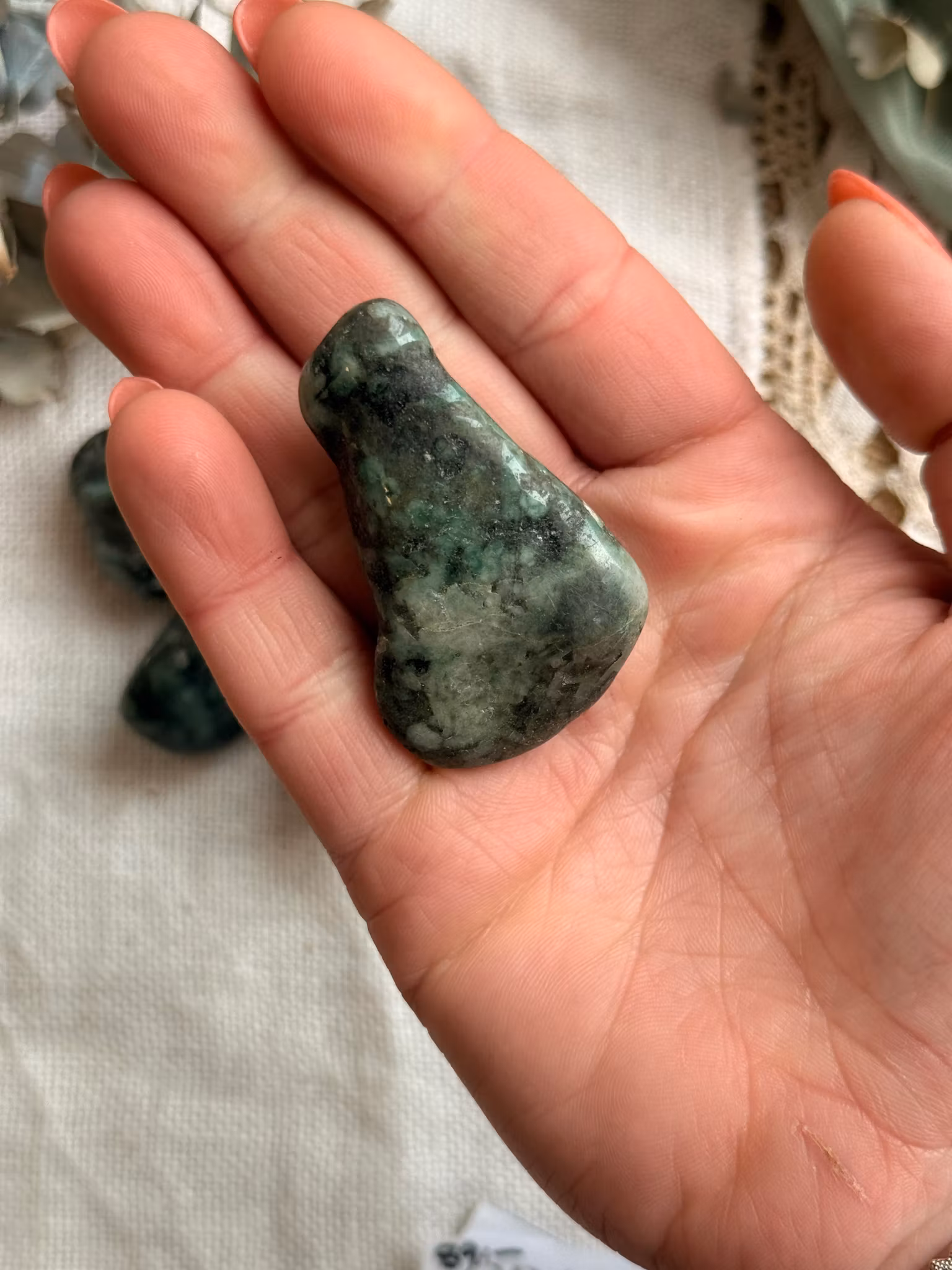 Färgen kan variera från ljusgrön till djupare smaragdgrön, ofta med naturliga inneslutningar som ger kristallen ett levande och organiskt uttryck. Den känns sval och tydlig i handen, med en närvaro som är lugn men inte passiv.