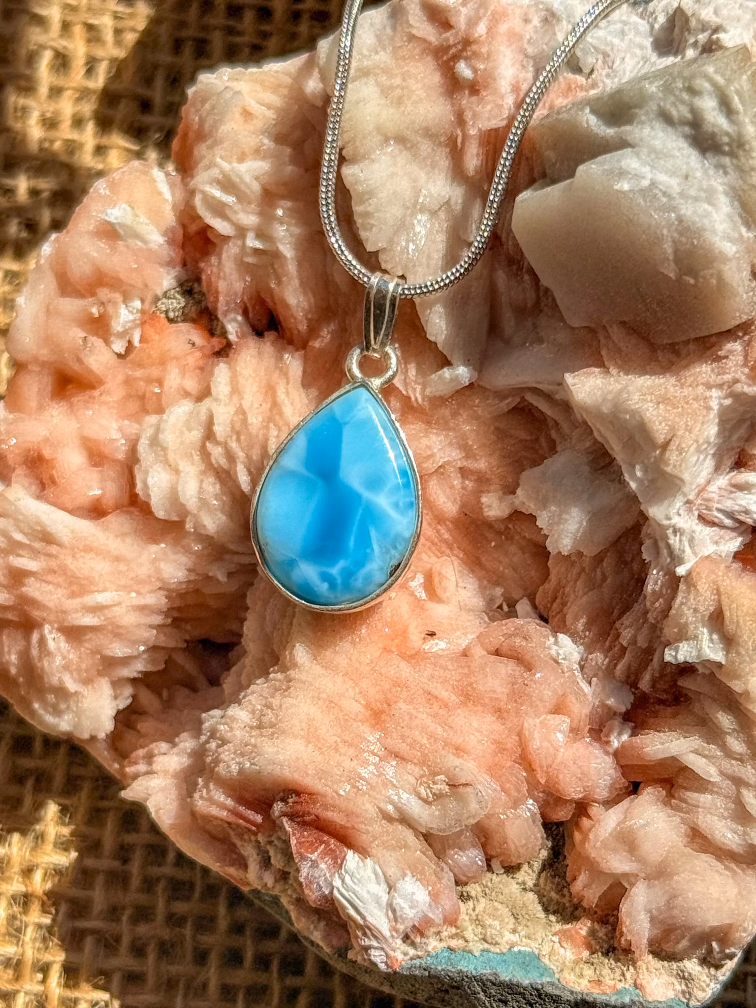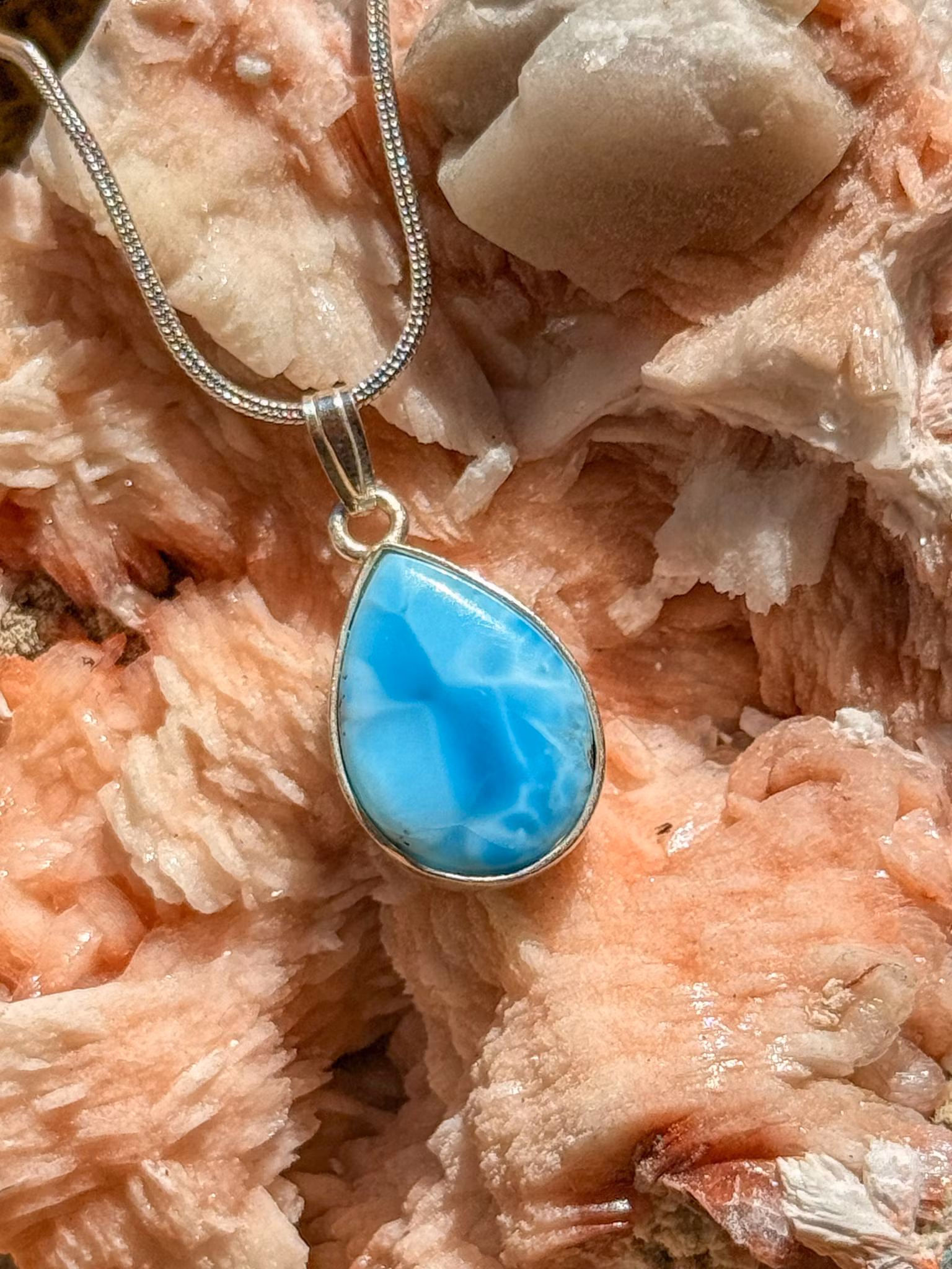 Larimar är en sällsynt kristall som bara hittas i Dominikanska Republiken. Dess blå färg, skapad av koppar i mineralet Pektolit, skiftar mellan ljusa himmelstoner och djupare turkos med vita virvlar som påminner om havets rörelse.