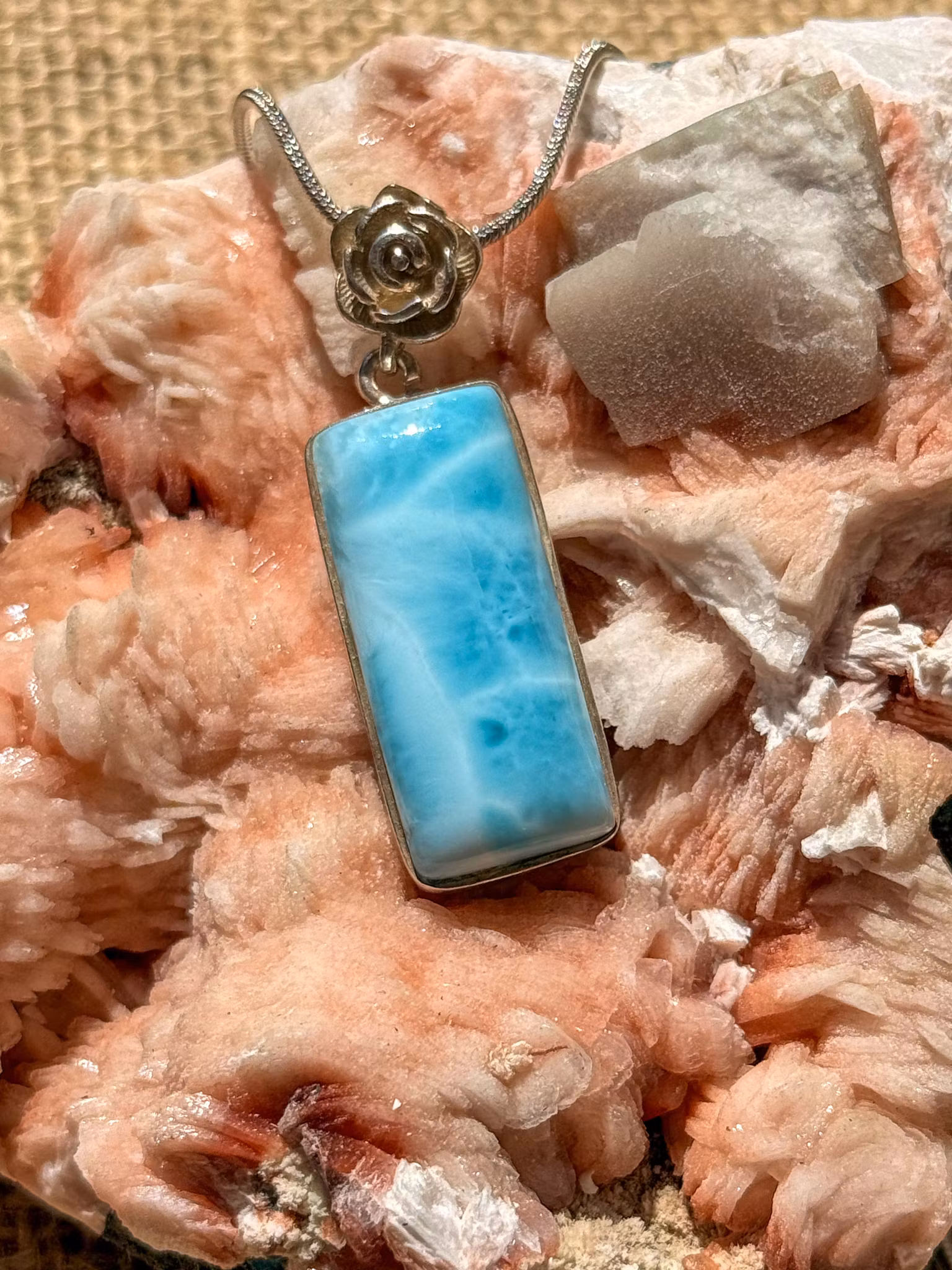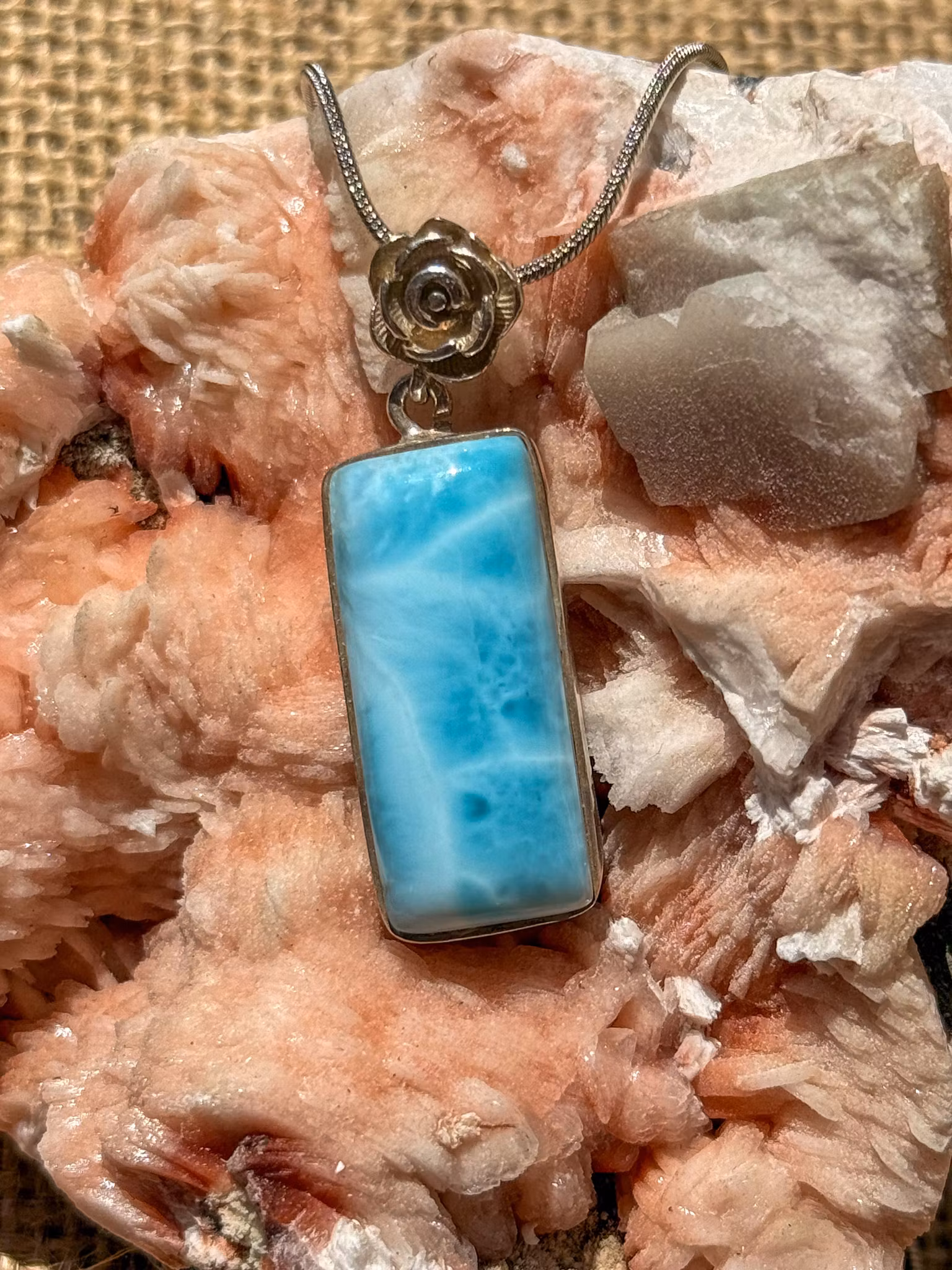 Ett elegant hänge där Larimars himmelsblå nyanser får ta plats. Infattad i äkta silver ramas kristallen in med mjuk styrka – ett tidlöst smycke att bära nära hjärtat.
