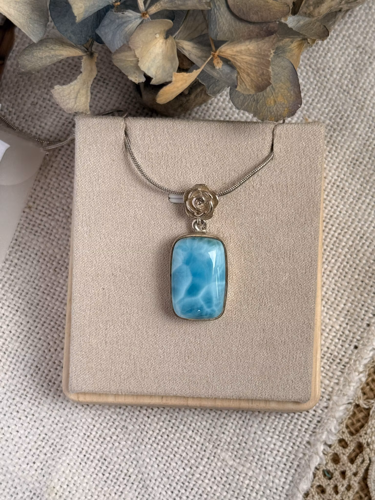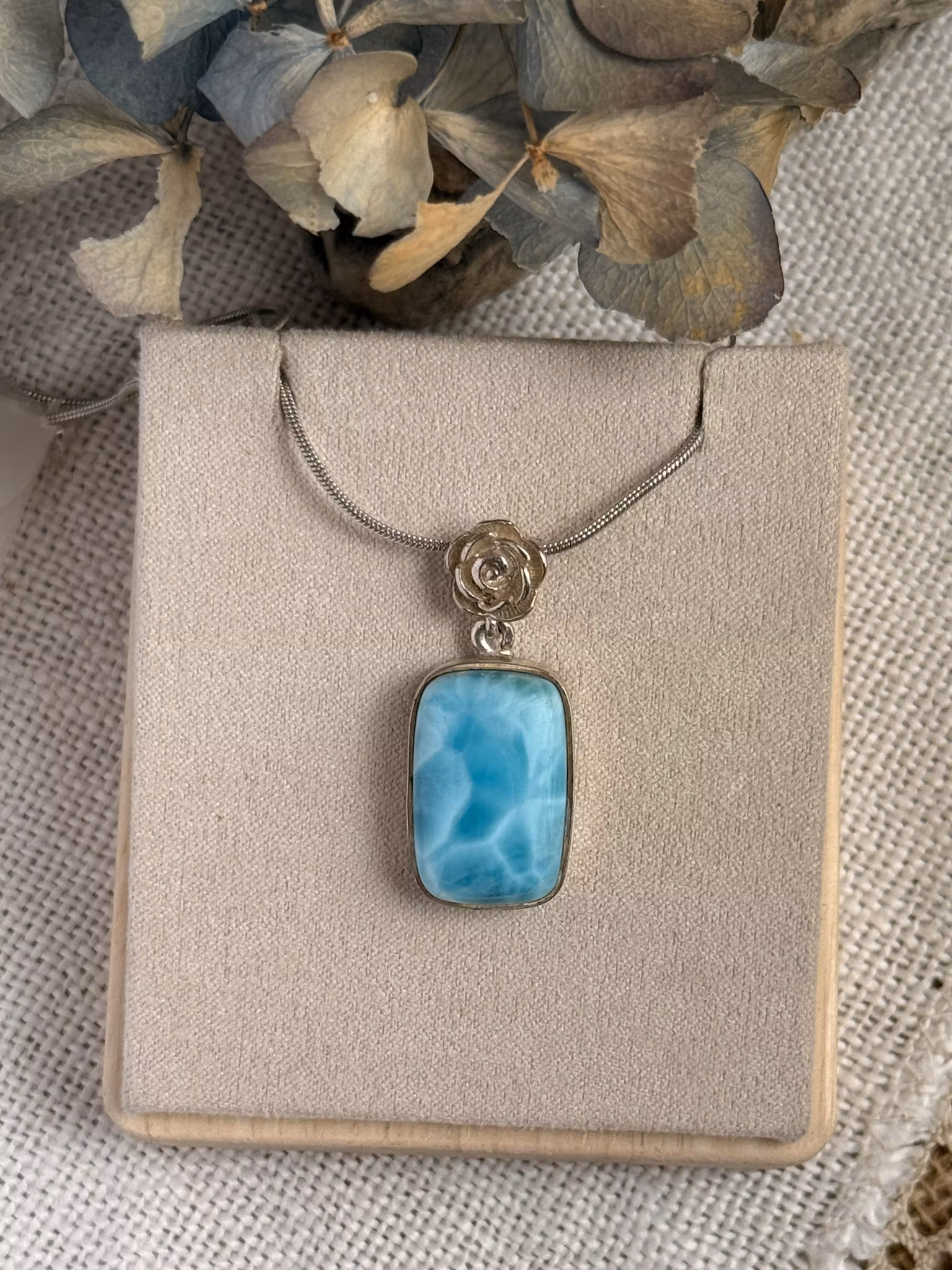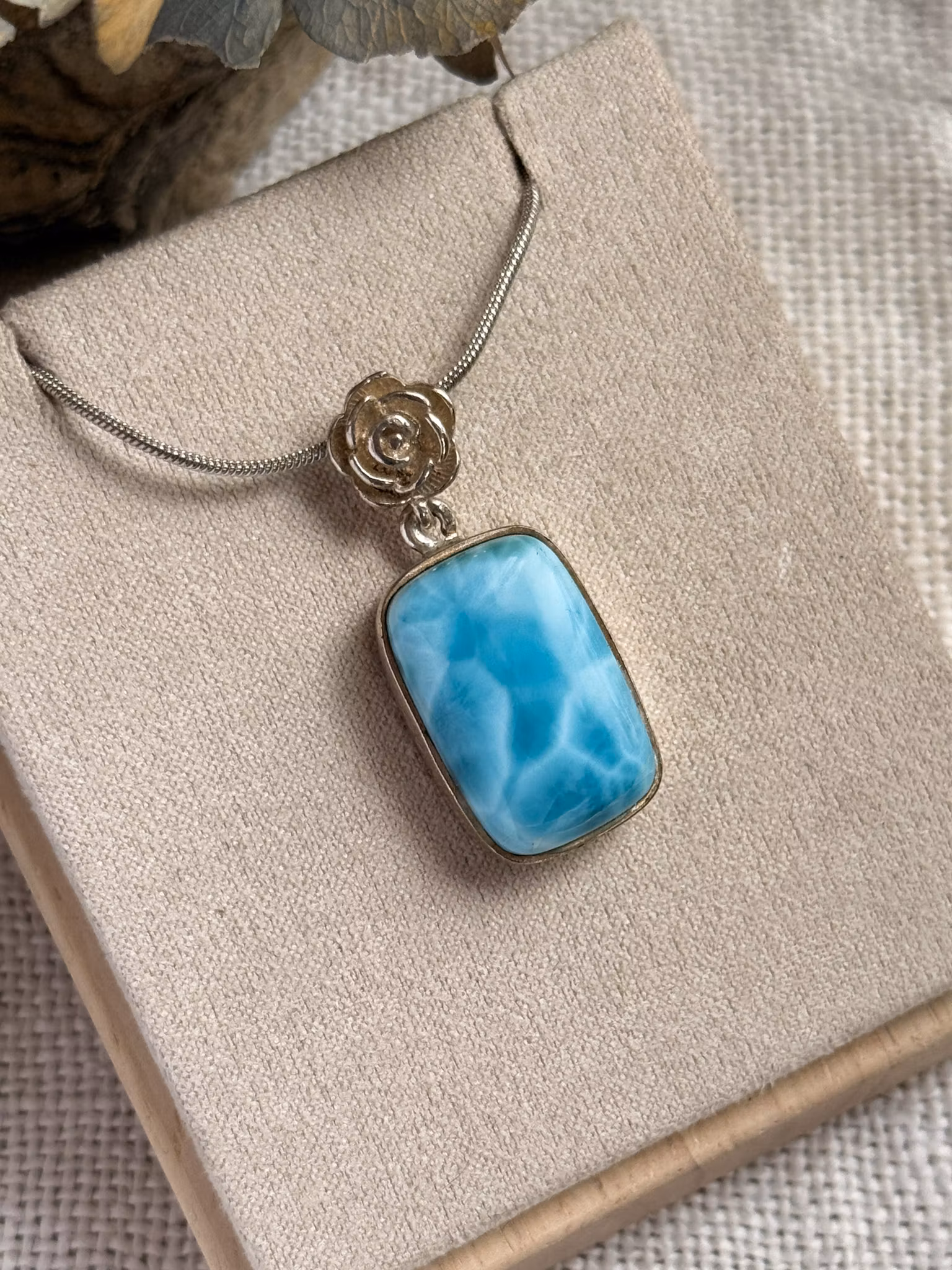 Larimar är något man ofta dras till när man behöver släppa kontroll, gå med flödet och följa sitt hjärta, utan att tappa sig själv på vägen.Det är en sällsynt v