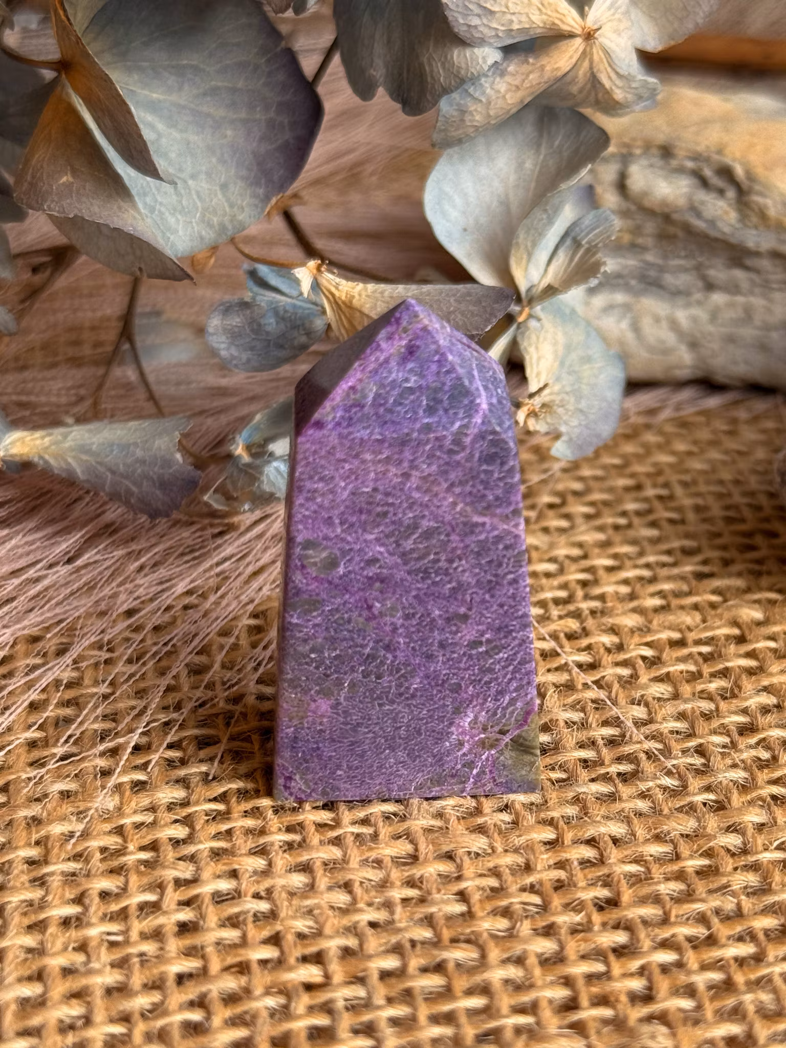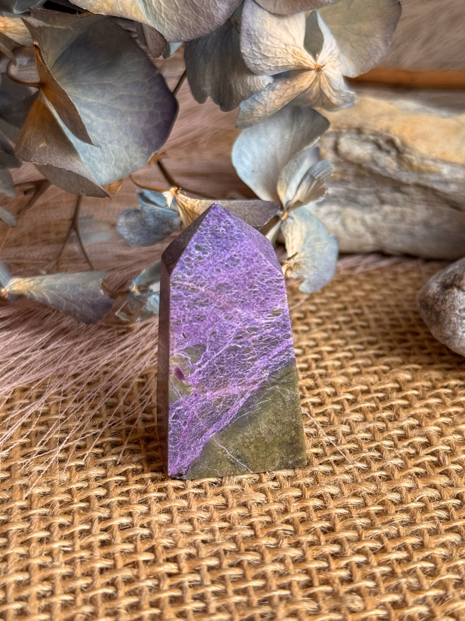 Stichtit med Serpentin är en mjuk lavendelfärgad kristall med inslag av grönt, en naturlig förening mellan hjärtats energi och jordens lugn.