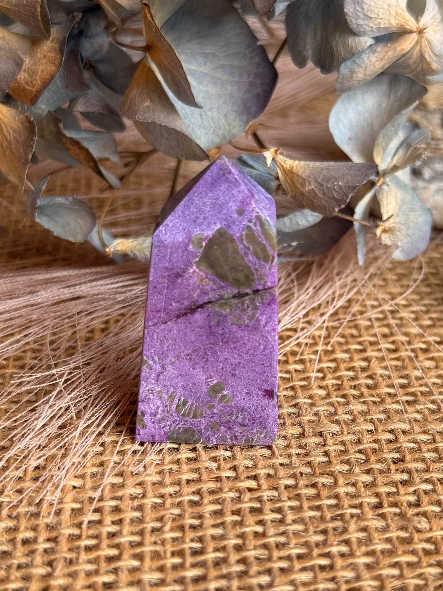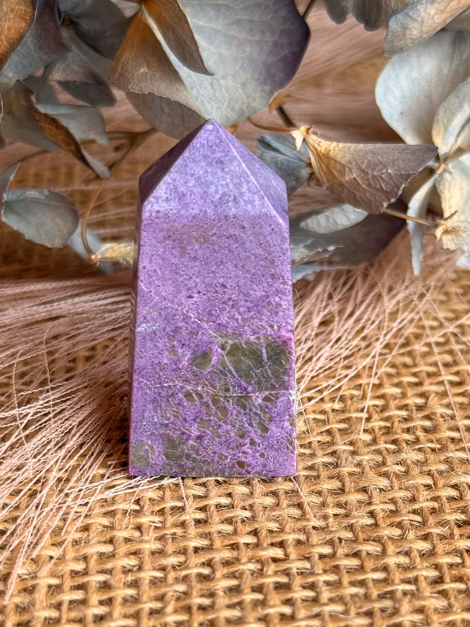Stichtit med Serpentin är en mjuk lavendelfärgad kristall med inslag av grönt, en naturlig förening mellan hjärtats energi och jordens lugn.Tillsammans väcker d