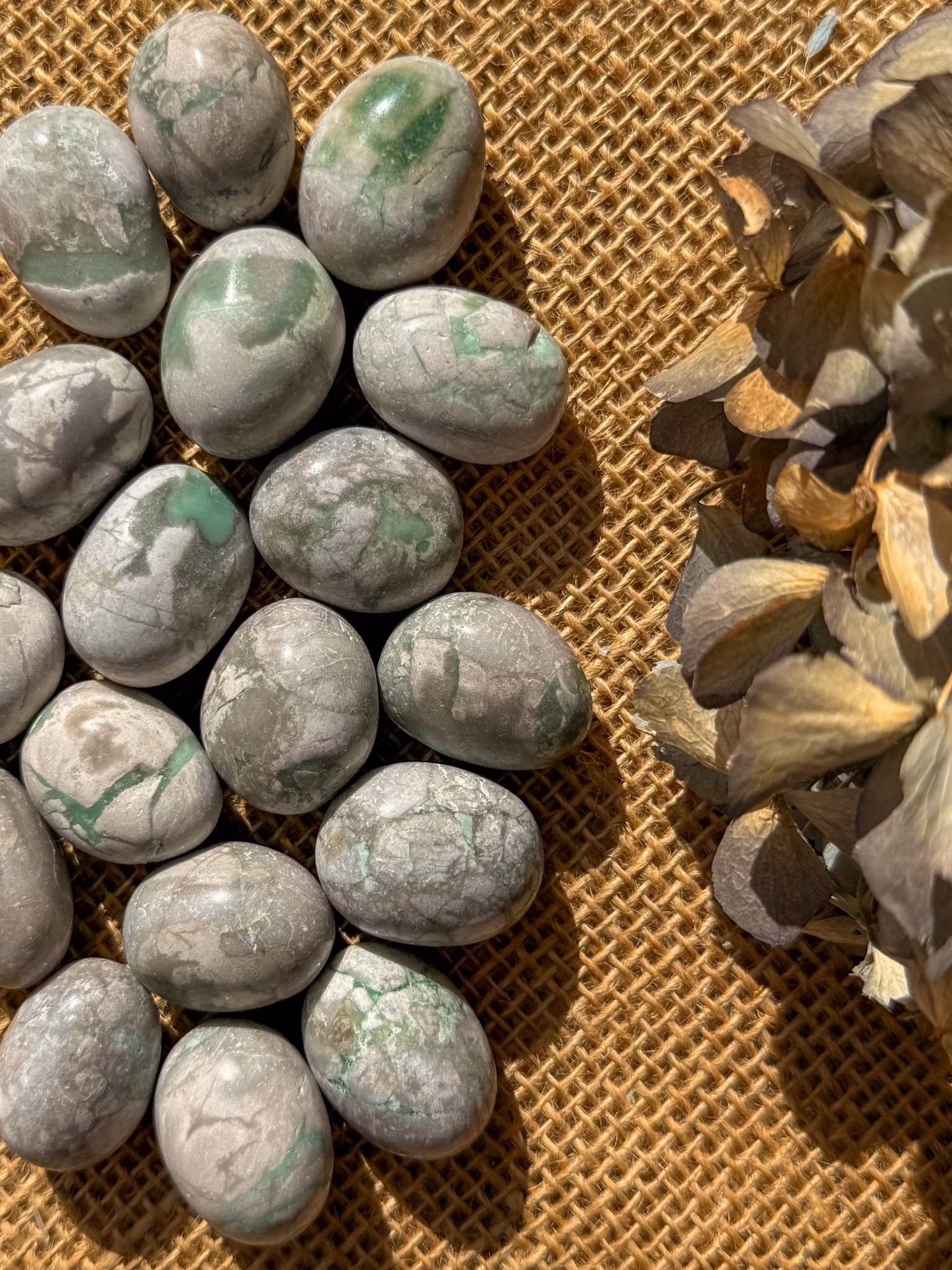 Spiderweb Variscit är en ovanlig och eftertraktad variant av variscit, känd för sina mjukt gröna toner vävda med grå och vita mönster som liknar spindelnät. Dessa mönster är naturens egen påminnelse om hur allt i livet hänger samman – en väv av relationer, känslor och upplevelser.