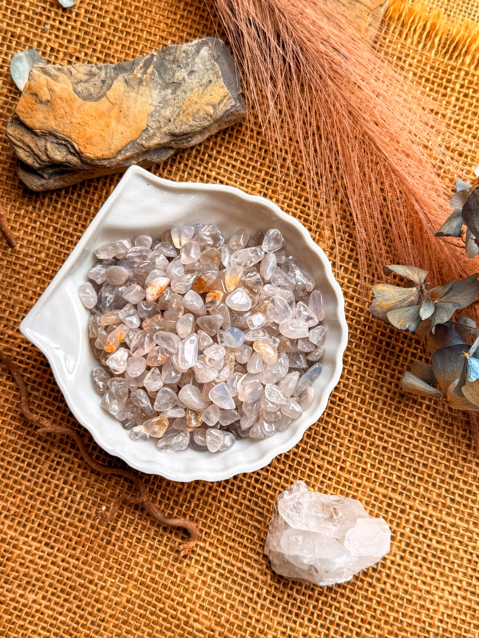 Kristallchips är perfekta när du vill sprida energi på ett mjukt och naturligt sätt. Strö dem runt ljus, i växter eller badvatten, skapa små kristallnät eller låt dem vila i en skål som dekor. Kristallchips bär samma energi som sina större former och påminner om att även det lilla kan bära stor kraft. Ett enkelt och vackert sätt att låta din intention flöda fritt i hemmet.