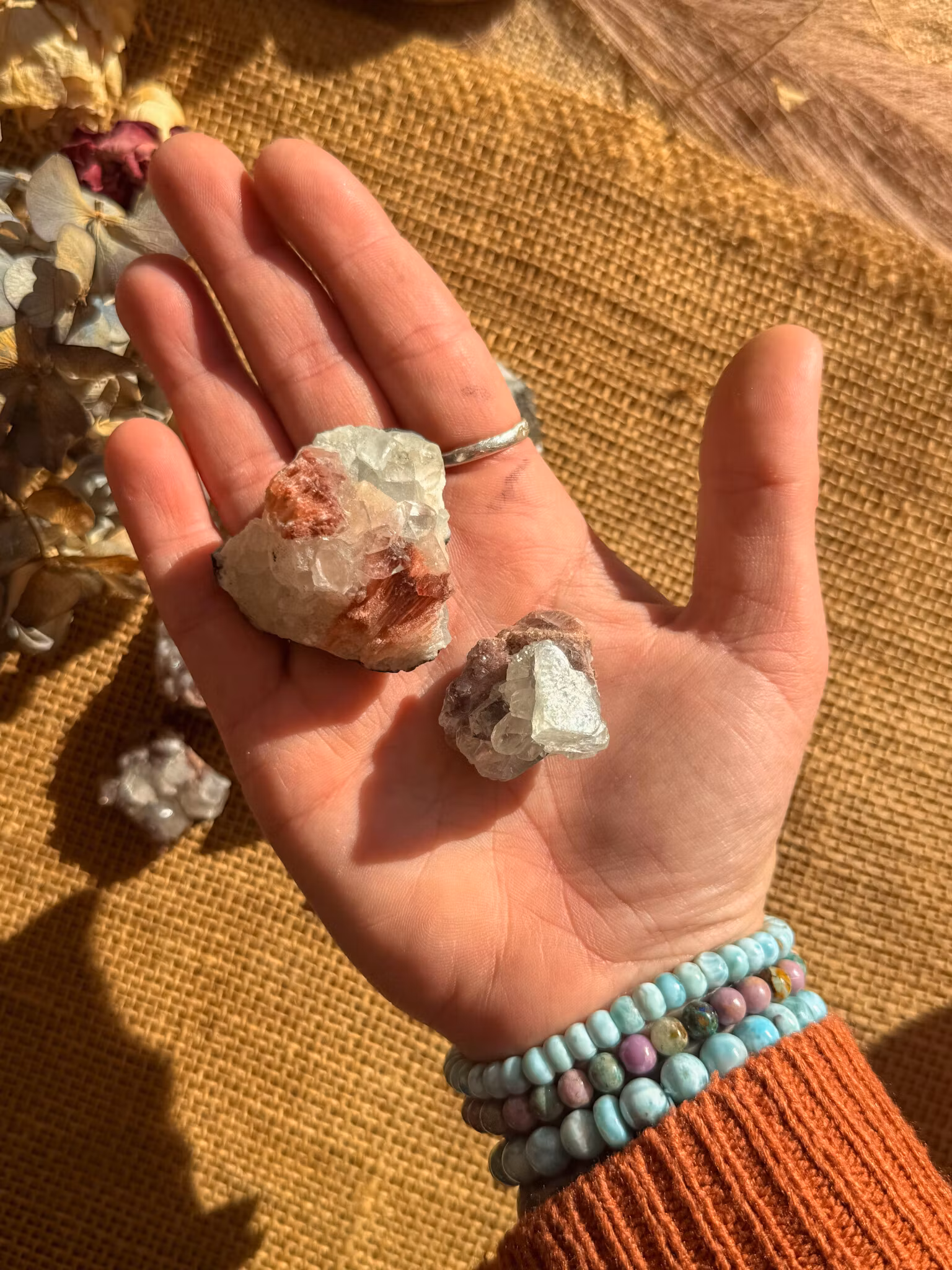 Apofyllit med röd heulandit säga väcka våra receptorer för kosmiska vibrationer och ansluta till högre energier omkring oss.