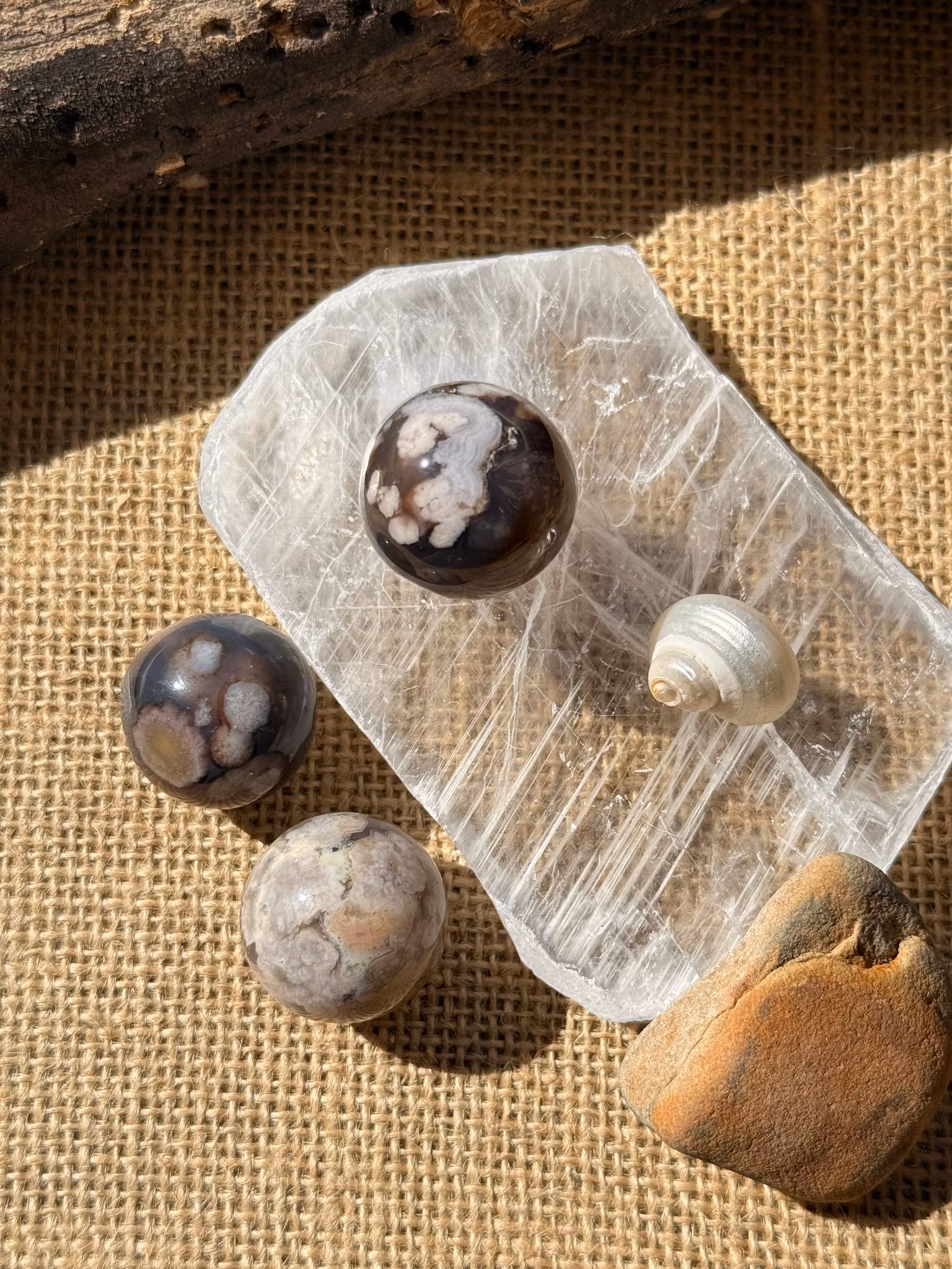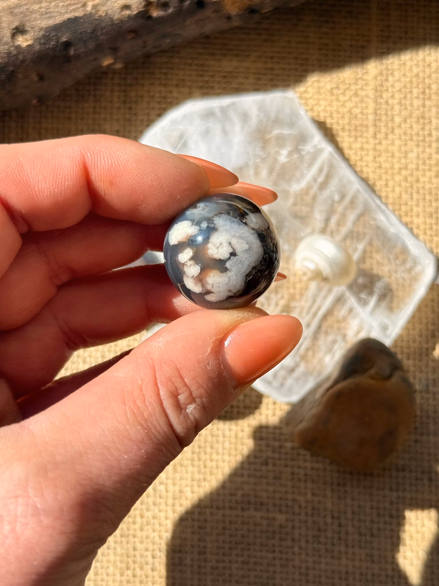Svart blomsteragat är en relativt ny variant av den älskade blomsteragaten, med ursprung från Madagaskar. Den bär samma mjuka, blommande energi som den klassiska varianten, men med ett djupare och mer kraftfullt uttryck. De röda och svarta inneslutningarna – skapade av järn, hematit och basalt – ger stenen en extra dimension av jordning, skydd och stabilitet, samtidigt som de väcker mod och livskraft.