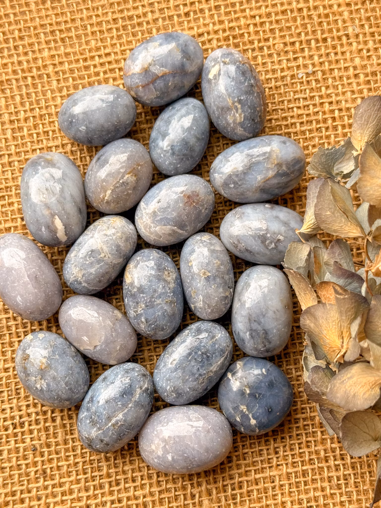 Den här varianten kommer från Madagaskar och kallas ofta blå opal, även om den inte alltid uppfyller alla kriterier för äkta opal. Den bär ändå samma mjuka energi, himmelska blå toner och lugna känsla av harmoni.