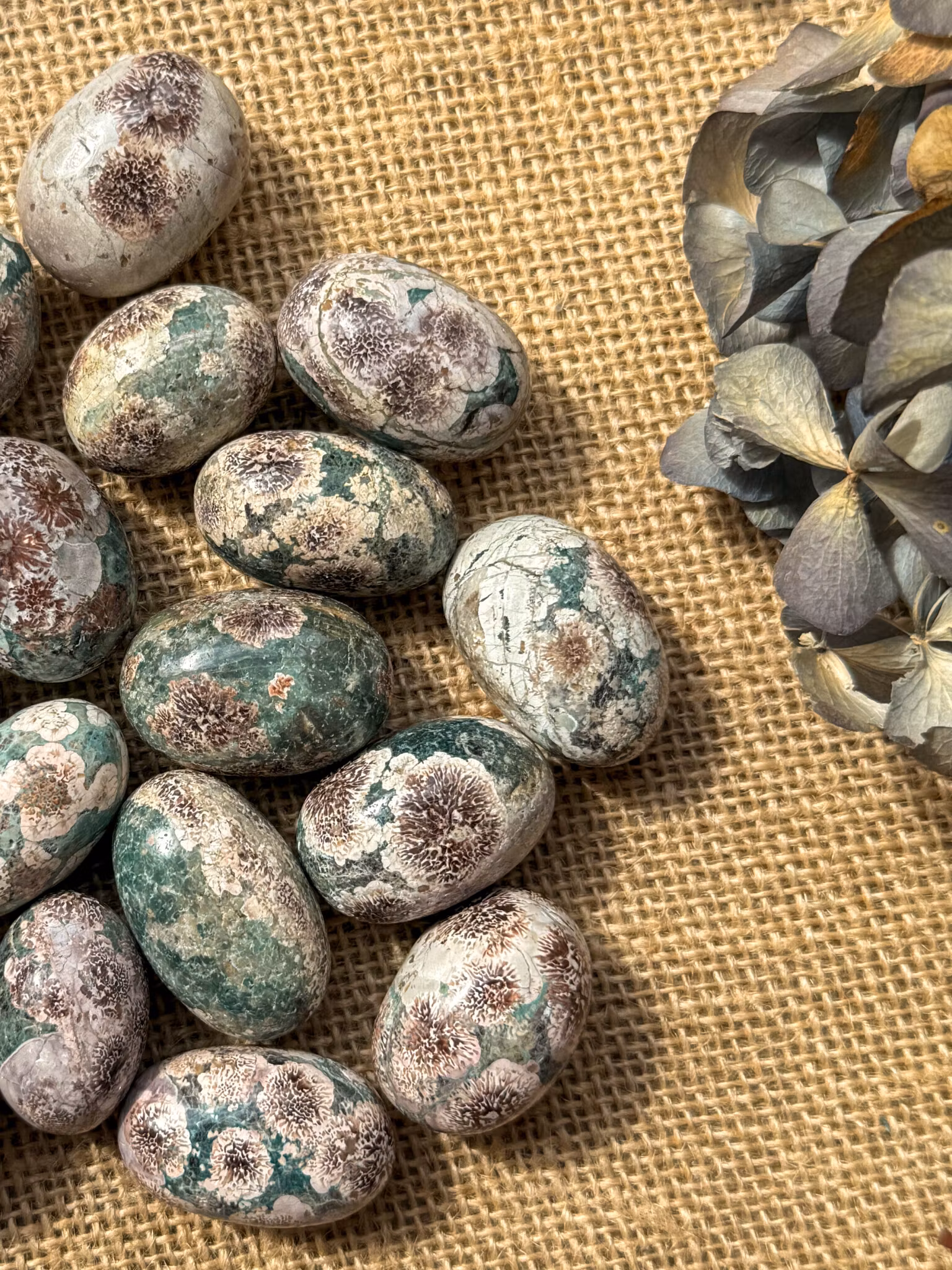 Grön blomster ryolit/ jasper är en kombination av Bird's Eye ryolit och grön jasper som kristalliseras i form av massor. Ryolitrosetterna kristalliseras i rosa till mörkröda nyanser och är utspridda i en grön jaspismatris. Denna sten upptäcktes nyligen på Madagaskar i början av 2020-talet.
