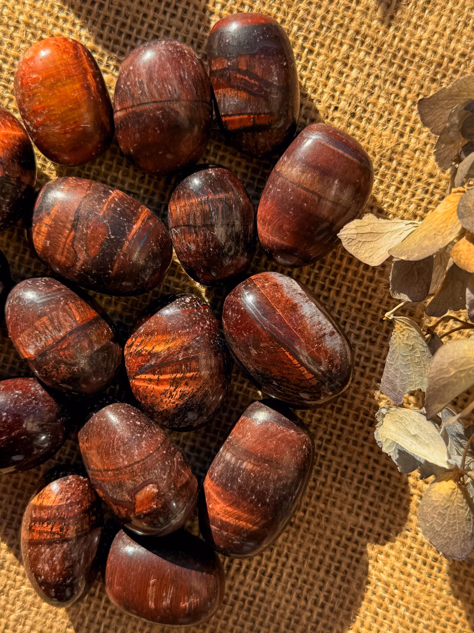 Oxöga, även känt som Röd Tigeröga, sägs kunna stimulera motivation och öka sexuell lust. Denna sten öppnar upp rotchakrat för att förankra sexuella tankar och lösa sexuella problem som kan påverka relationer negativt.
