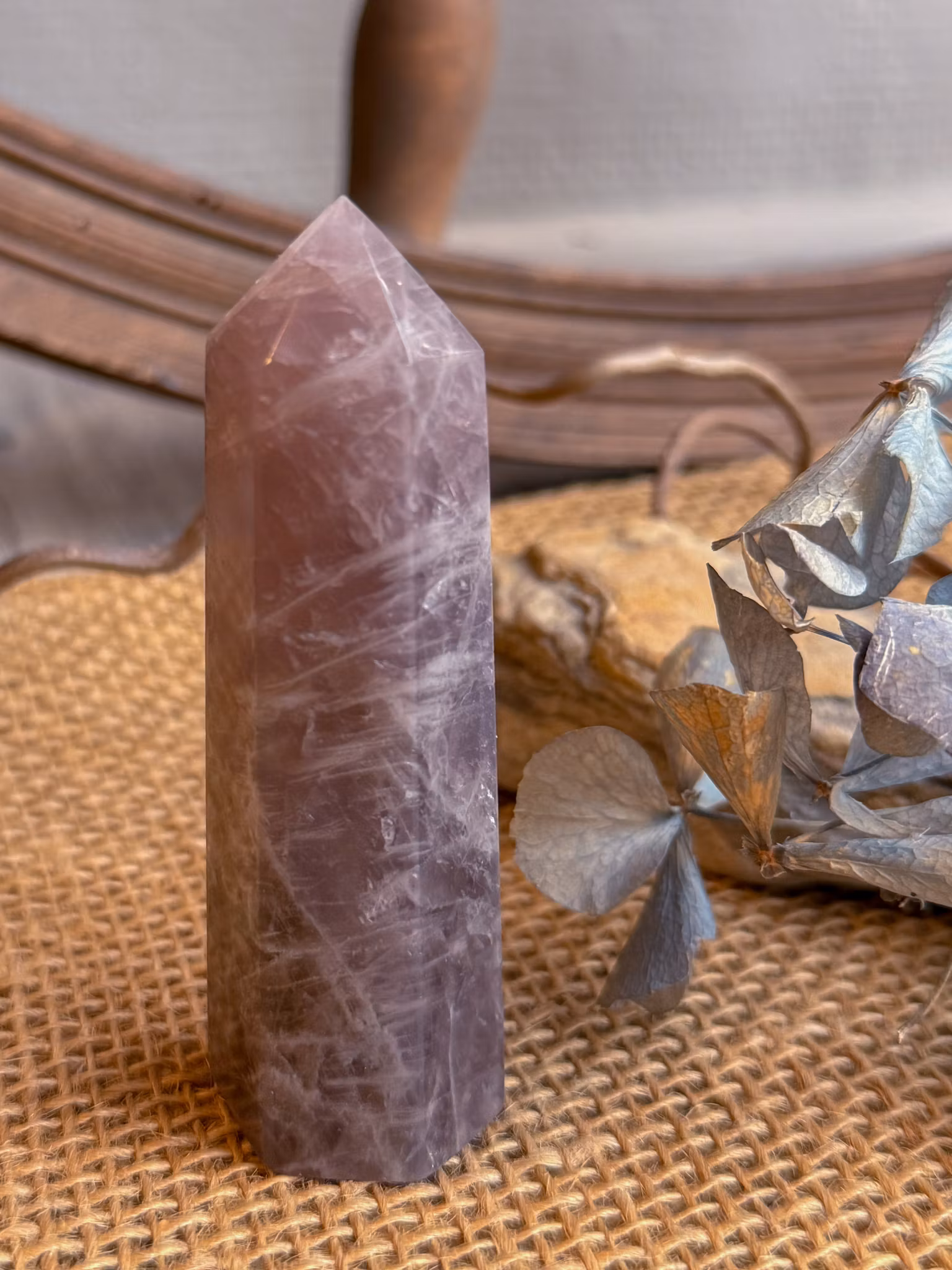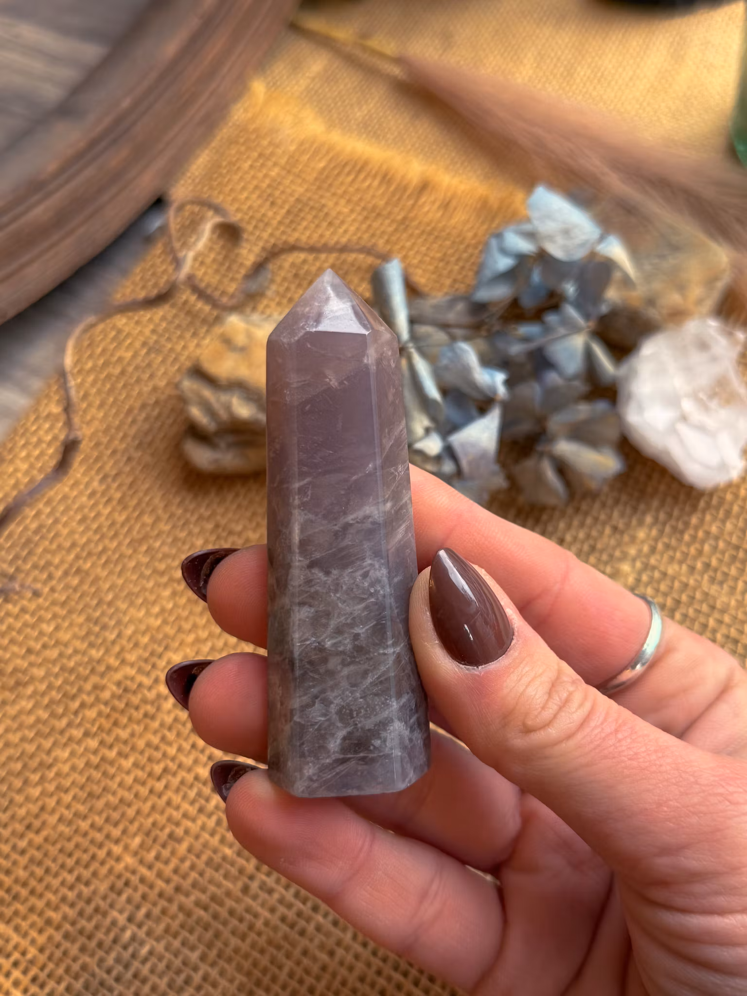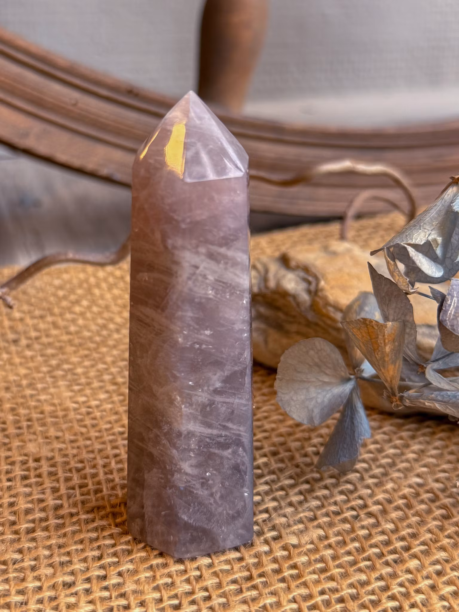 Blå Rosenkvarts bär en mjuk ton av blått, rosa, lila och grått. Den är ovanlig, ibland missförstådd för många tror att den är en “sämre” variant av rosenkvarts. Men sanningen är den motsatta. Blå Rosenkvarts är en högkvalitativ kristall som förenar tre mineraler i ett: rosenkvarts, girasol och dumortierit.