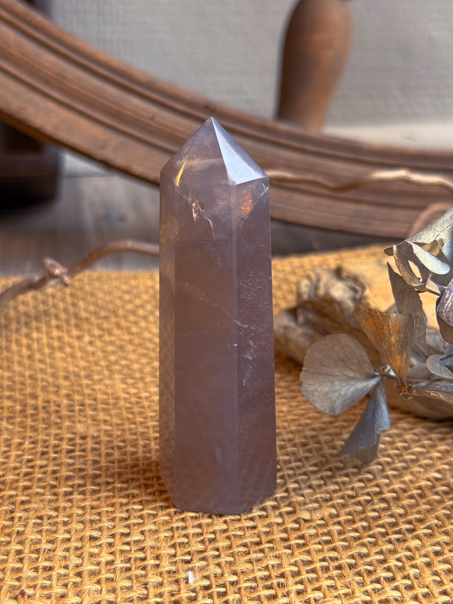 Blå Rosenkvarts bär en mjuk ton av blått, rosa, lila och grått. Den är ovanlig, ibland missförstådd för många tror att den är en “sämre” variant av rosenkvarts. Men sanningen är den motsatta. Blå Rosenkvarts är en högkvalitativ kristall som förenar tre mineraler i ett: rosenkvarts, girasol och dumortierit.