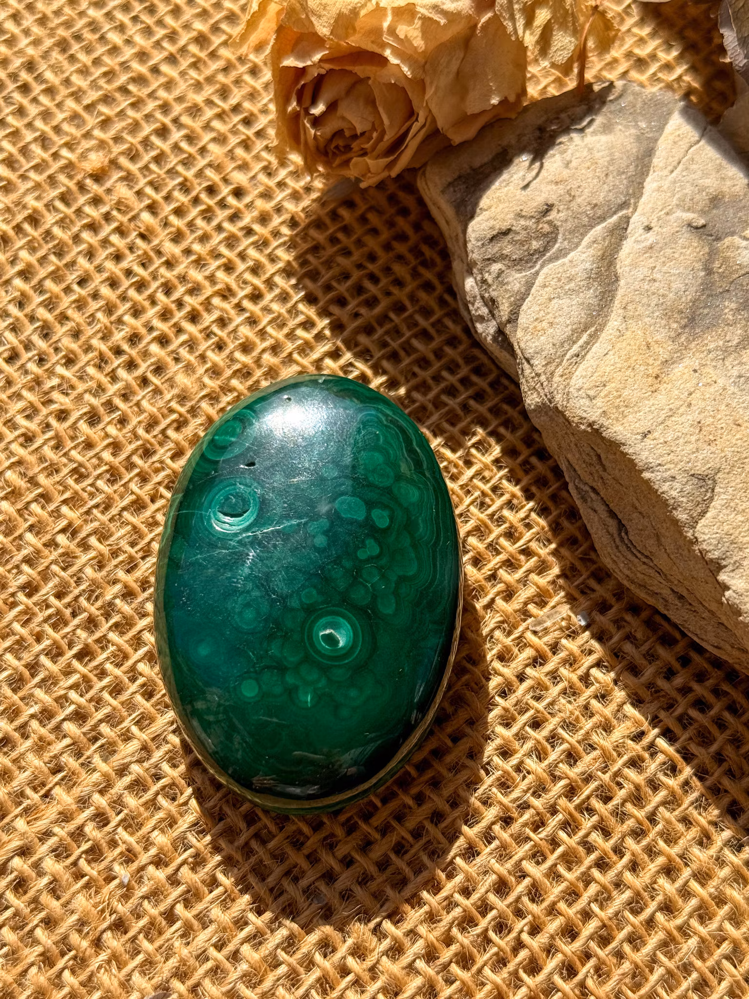 Botryoidal Malakit utav ljusare kvalité och levande mönster. Denna variant visar de hypnotiska cirklar och bubbliga formationer som gör botryoidal malakit så unik. Till skillnad från den mörkare, tyngre malakit du ofta ser, har denna högre kvalité med ljusare inslag som får hela kristallen att kännas levande och pulserande.