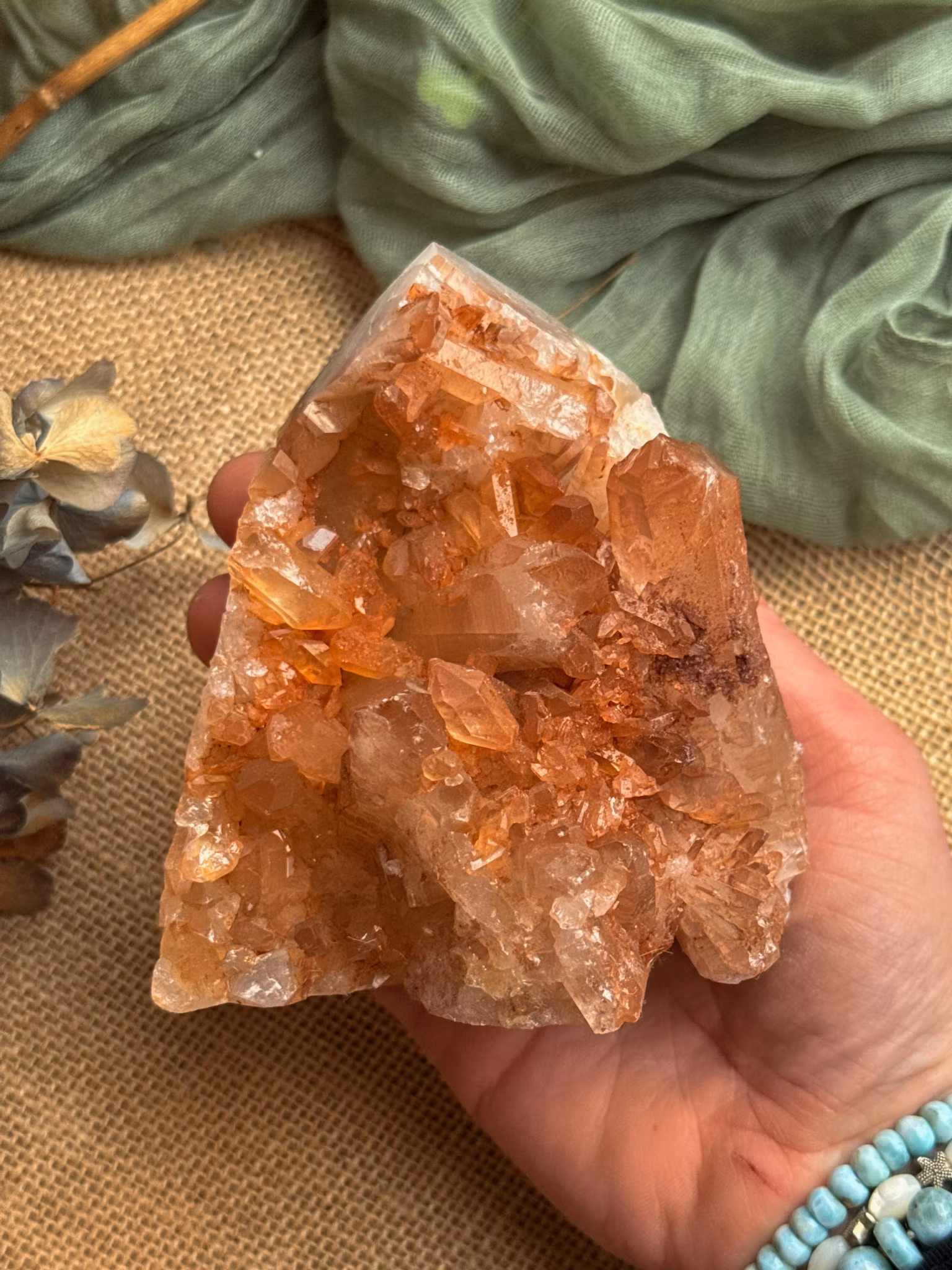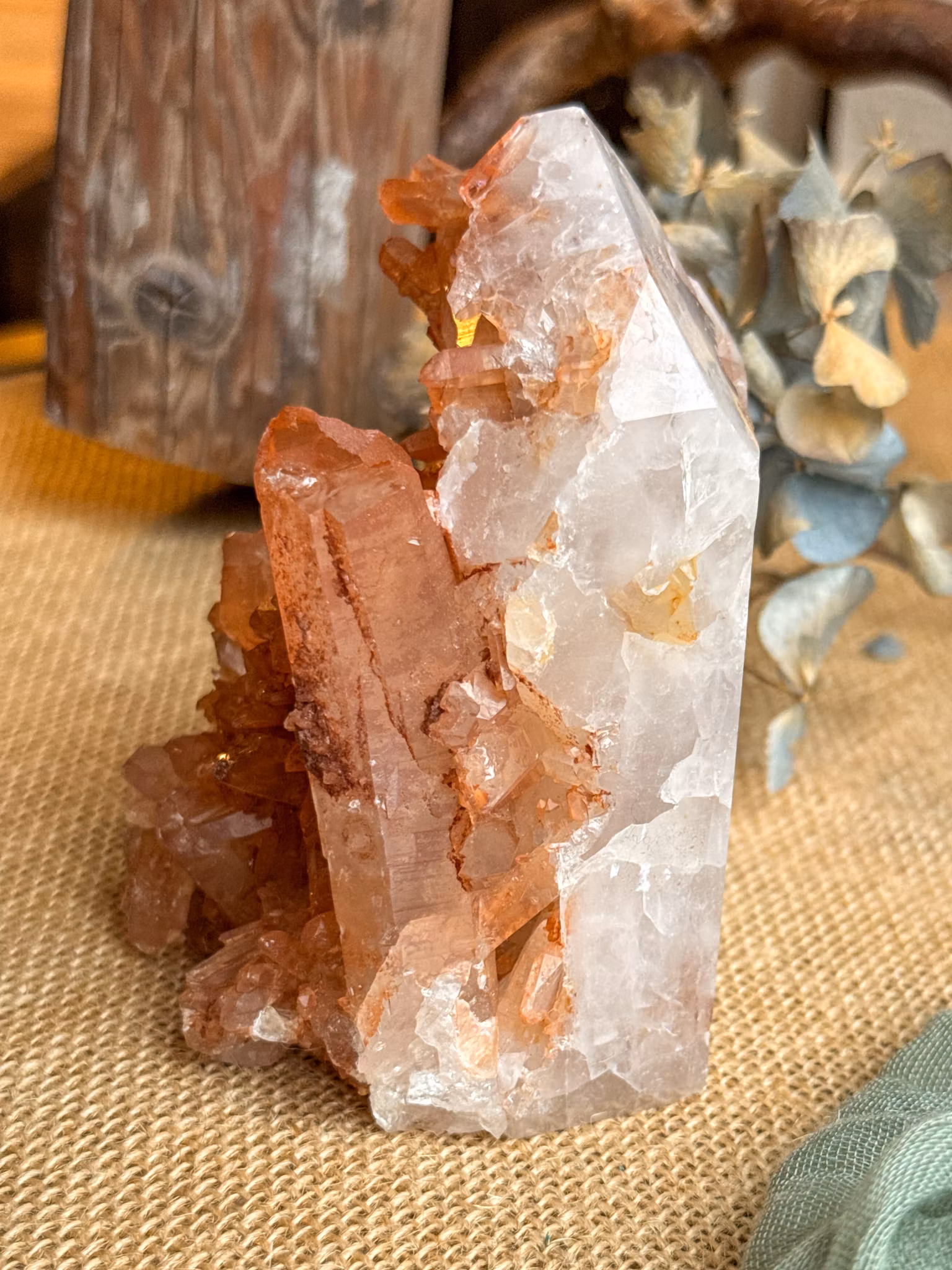 Tangerinkvarts är en gåva från jordens inre med en varm orange ton. Färgen kommer från järn som lagt sig runt kristallen. Den kan skifta från ljus champagne till djup rostorange. Varje kristall är unik.