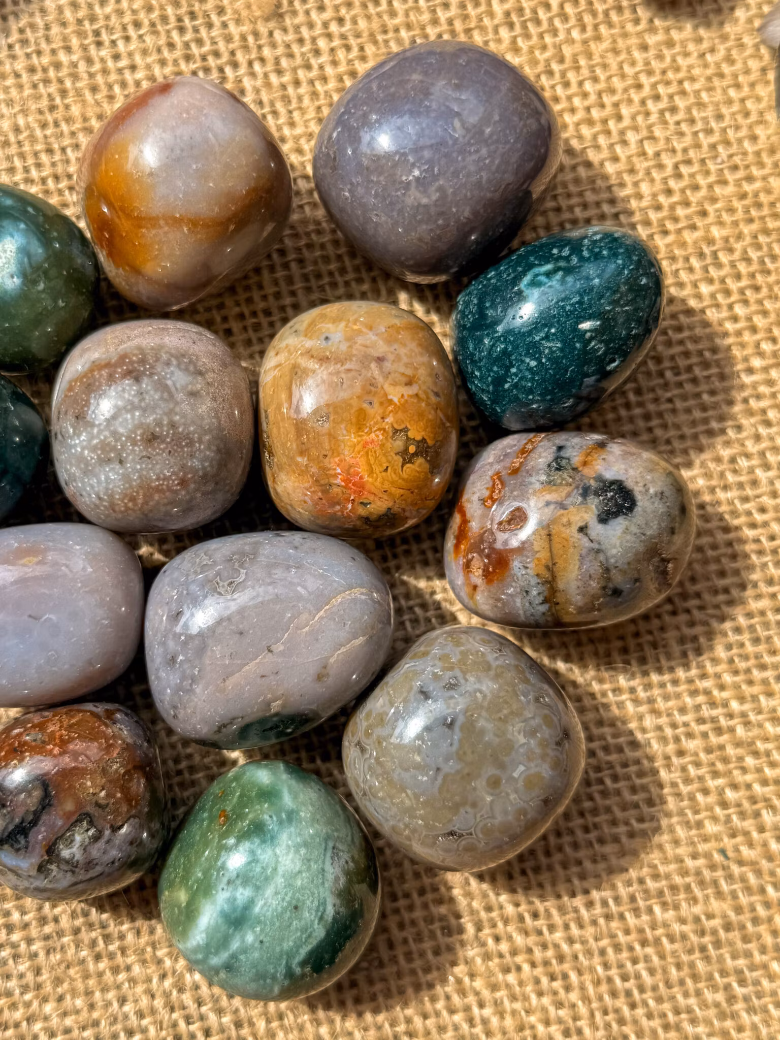 Ocean Jasper, hämtar sin lugnande kraft från elementet vatten och jord. Det är en sten av styrka, avslappning och förnyelse med en långsam, jämn frekvens och en djup cirkulär energi som förkroppsligar alla tings sammanlänkning. Ocean Jasper är kopplad till den förlorade staden Atlantis och håller sin mystiska kunskap i sin form. Denna sten är särskilt gynnsam för meditation och centrering, och ger tillgång till uråldrig visdom och lektioner från tidigare liv. Som tidvatten som ebbar och flyter längs en strand, tar Ocean Jasper upp till ytan länge dolda och olösta känslomässiga problem och använder sina milda närande energier för att ge helande. Ocean Jaspis med en dominerande grön färg är en tillväxtkristall, en kraftfull kanal för jordens livskraft för födelse, utveckling och skapelse, och kraften i naturens ständiga förnyelse.