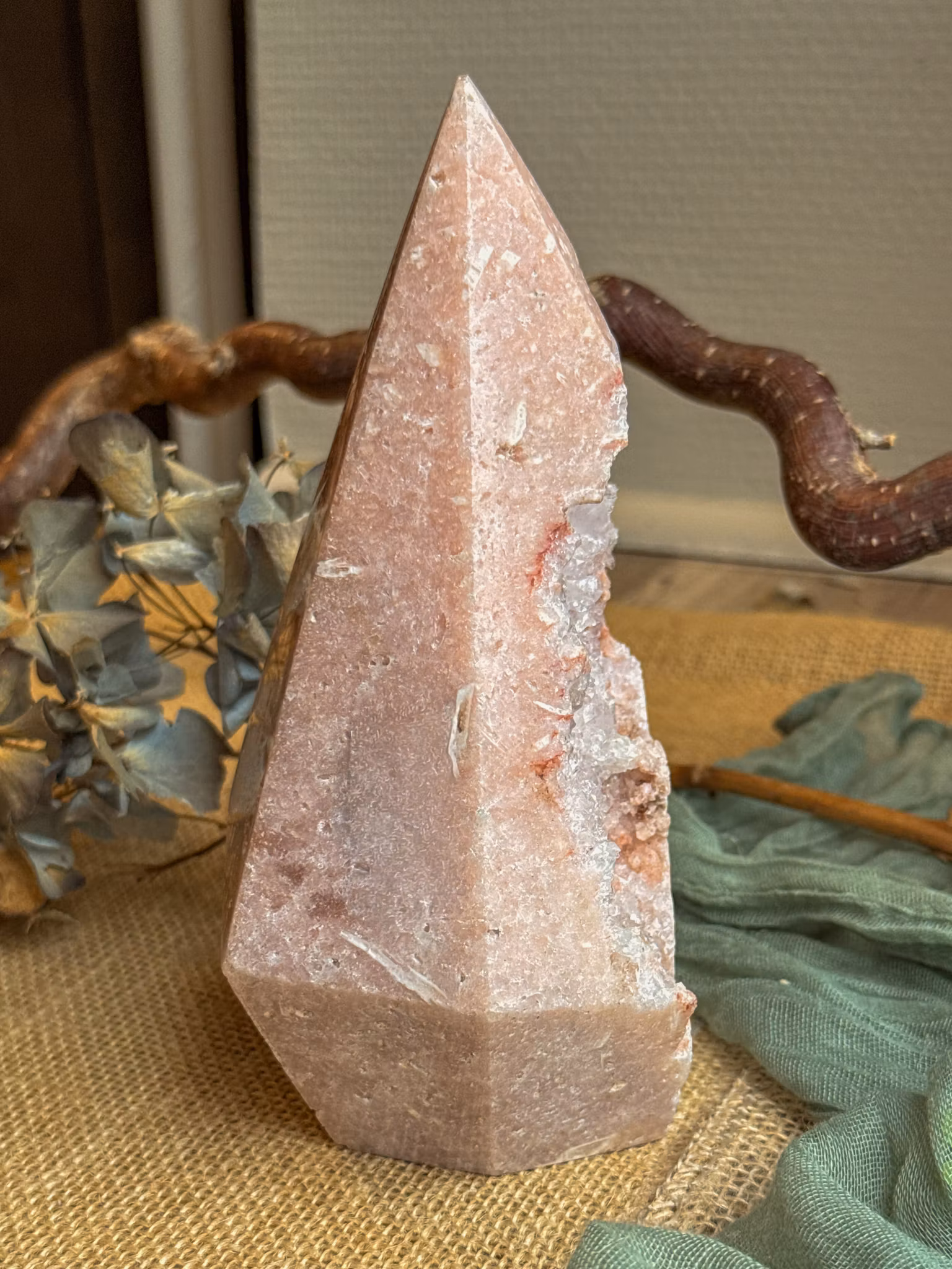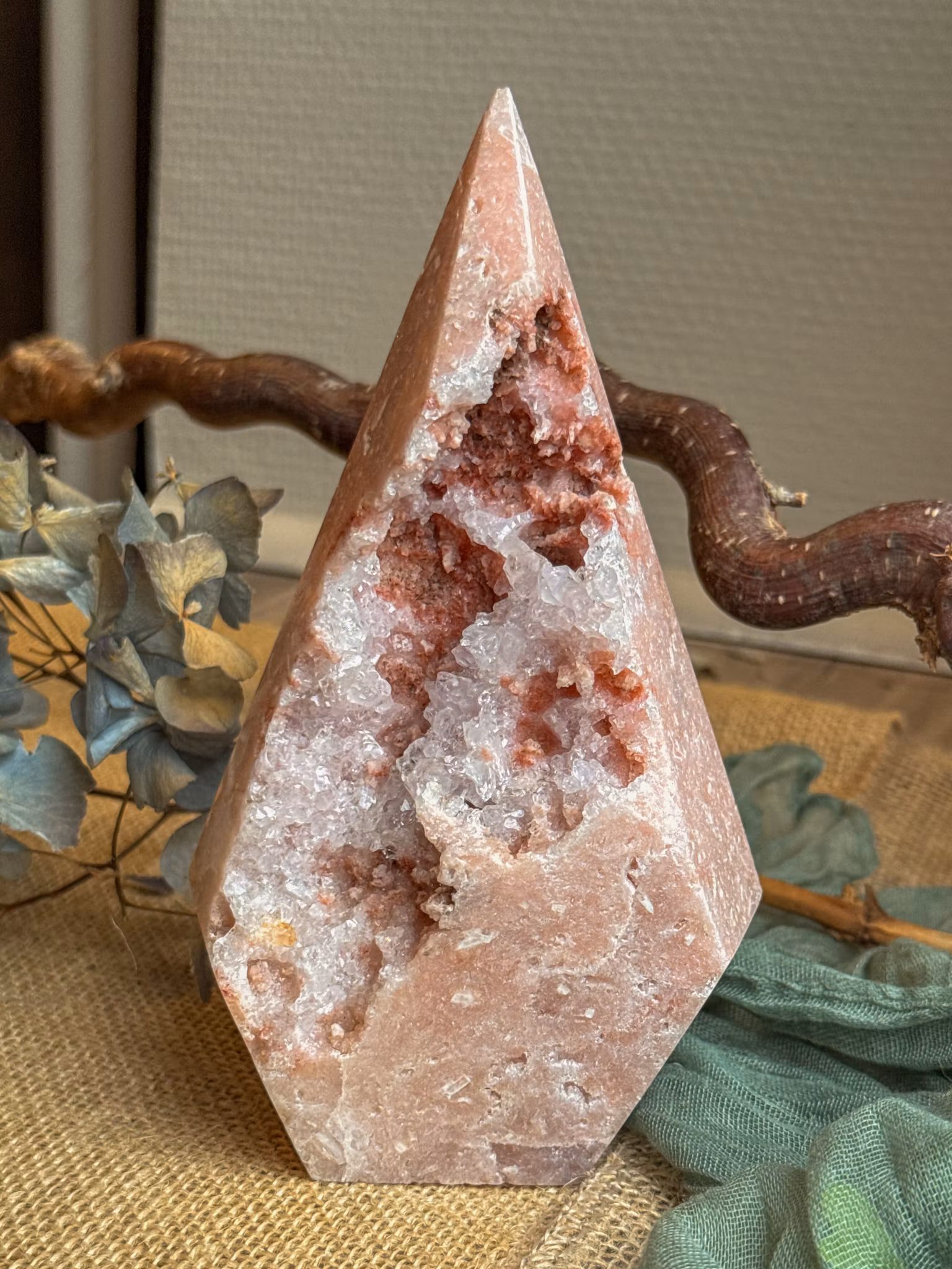 Rosa ametist känns som en mjuk hand över hjärtat. En kristall som bär en stillsam rosa ton tack vare små mängder järn och ibland inslag av mangan. Det är det som ger den dess milda färgskiftning och den lugna, hjärtöppnande energi som skiljer den från den klassiska lila ametisten. Den rör sig i ett annat register – mjukare, mer läkande, mer inåtvänt.