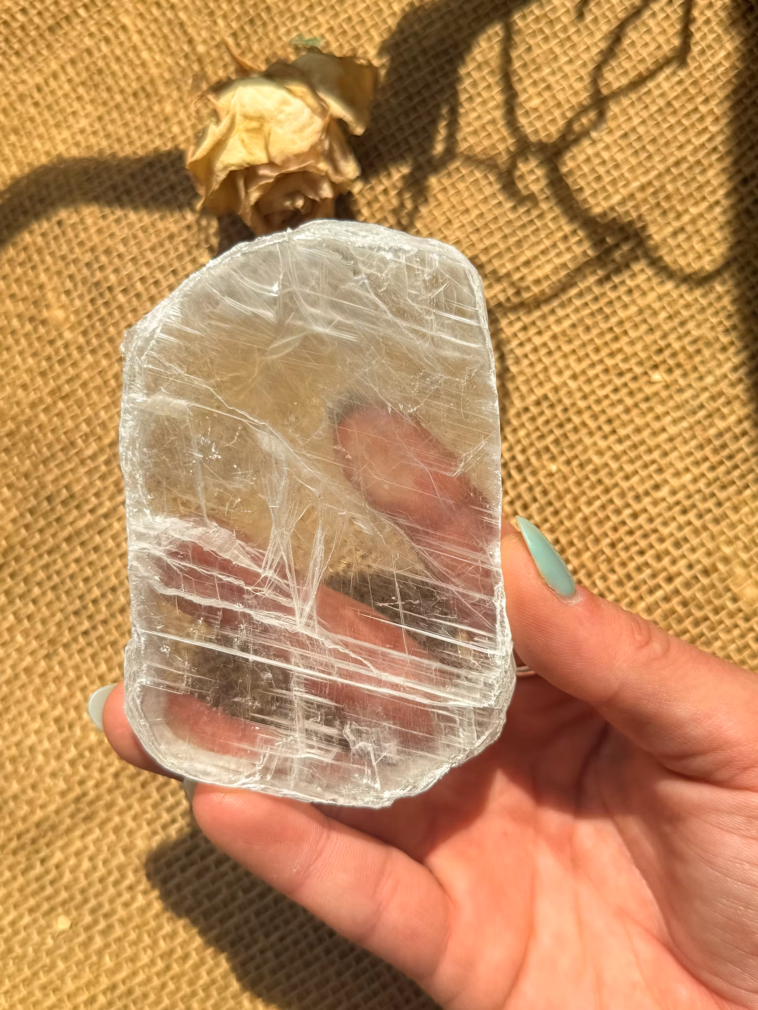 Naturlig äkta Selenit är en vacker, transparent kristall som tillhör gypsum-familjen och är känd för sin mjuka glans och förmåga att reflektera ljus på ett unikt sätt. Den här varianten är ofta förväxlad med Satin Spar men skiljer sig genom sin glasklara struktur och det faktum att den inte är lika fiberrik. Selenit är en kraftfull sten som ofta används för att rena och rensa energi i omgivningen. Den bär på en lugnande och helande energi som är förknippad med både andlig upplysning och psykisk klarhet.