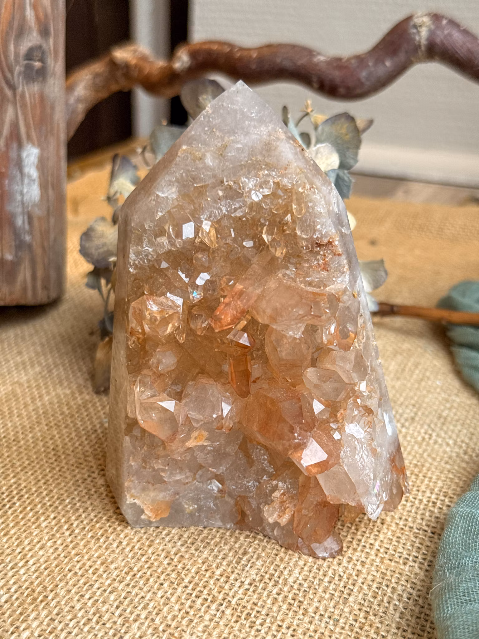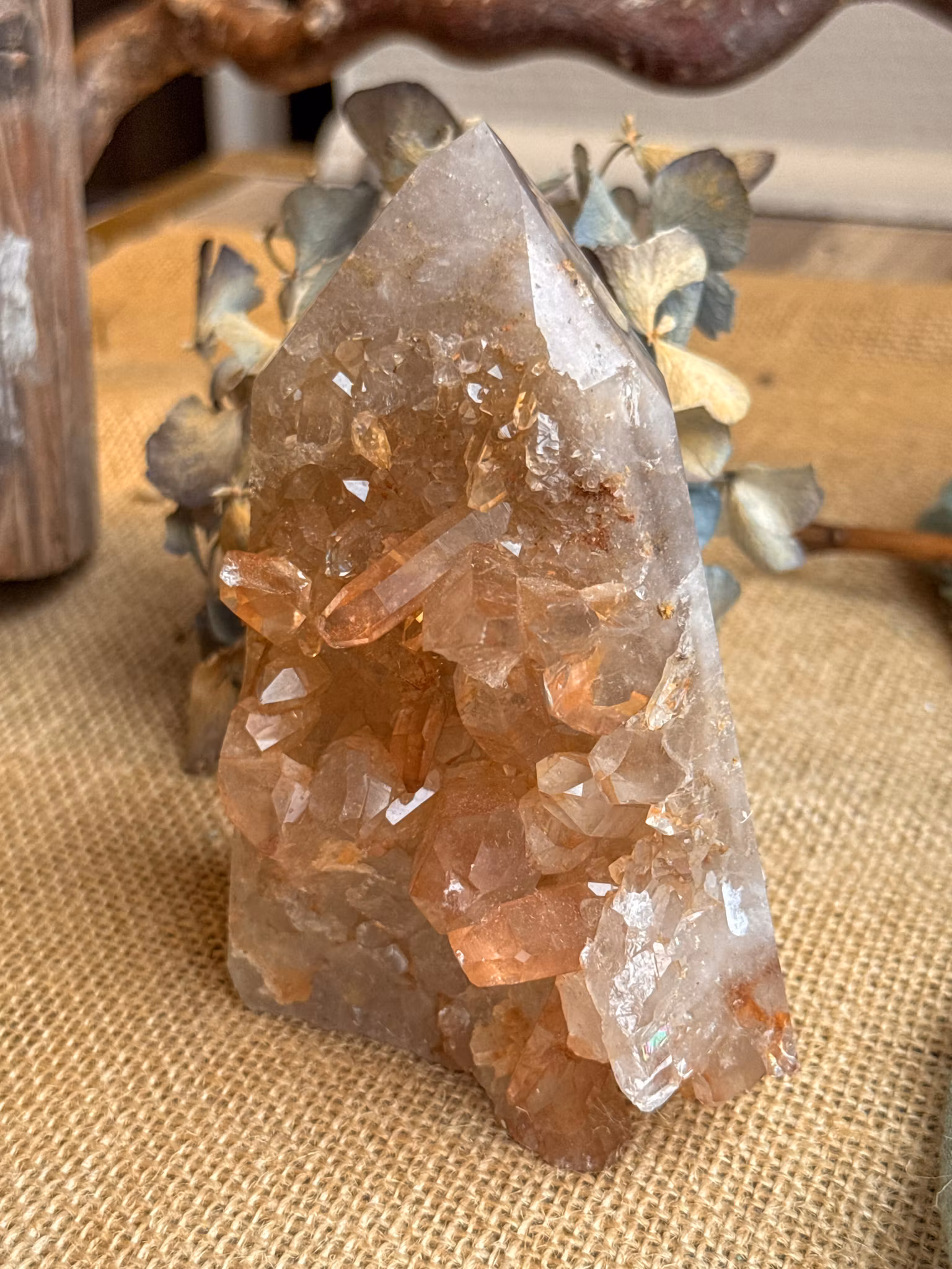Tangerinkvarts är en gåva från jordens inre med en varm orange ton. Färgen kommer från järn som lagt sig runt kristallen. Den kan skifta från ljus champagne till djup rostorange. Varje kristall är unik.