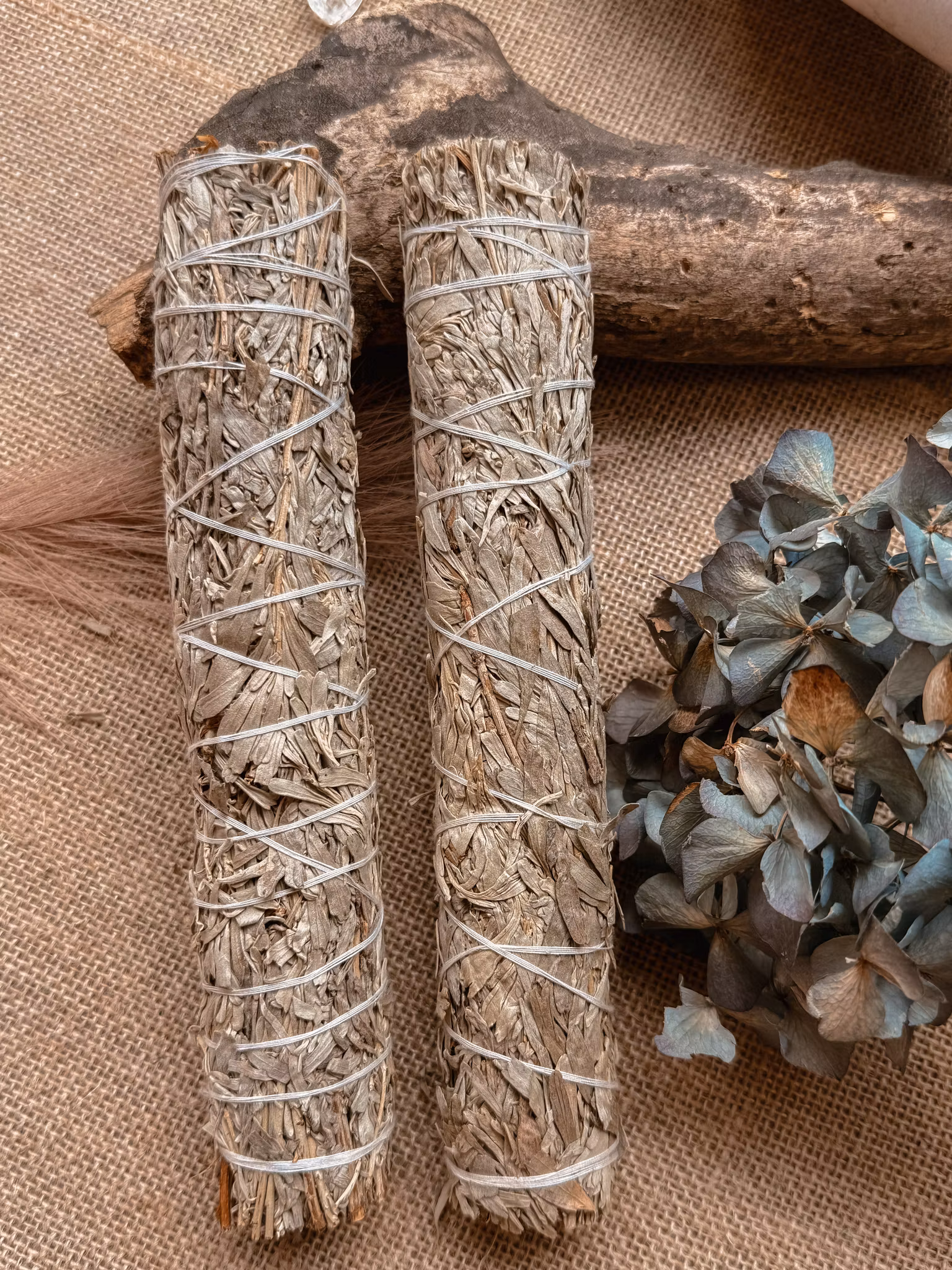 Denna salvia är skördad för hand på privat mark i San Bernardinos berg i Kalifornien, ett område där både vit och blå salvia växer vilt, omgiven av klar luft, bergsterräng och ett klimat som stärker örtens naturliga kraft. Varje bunt binds med bomullssnöre, torkas varsamt i små batcher och bär på ren energi direkt från jorden. En rökelse med tydligt ursprung, rotad i respekt för naturen och traditionellt hantverk.
